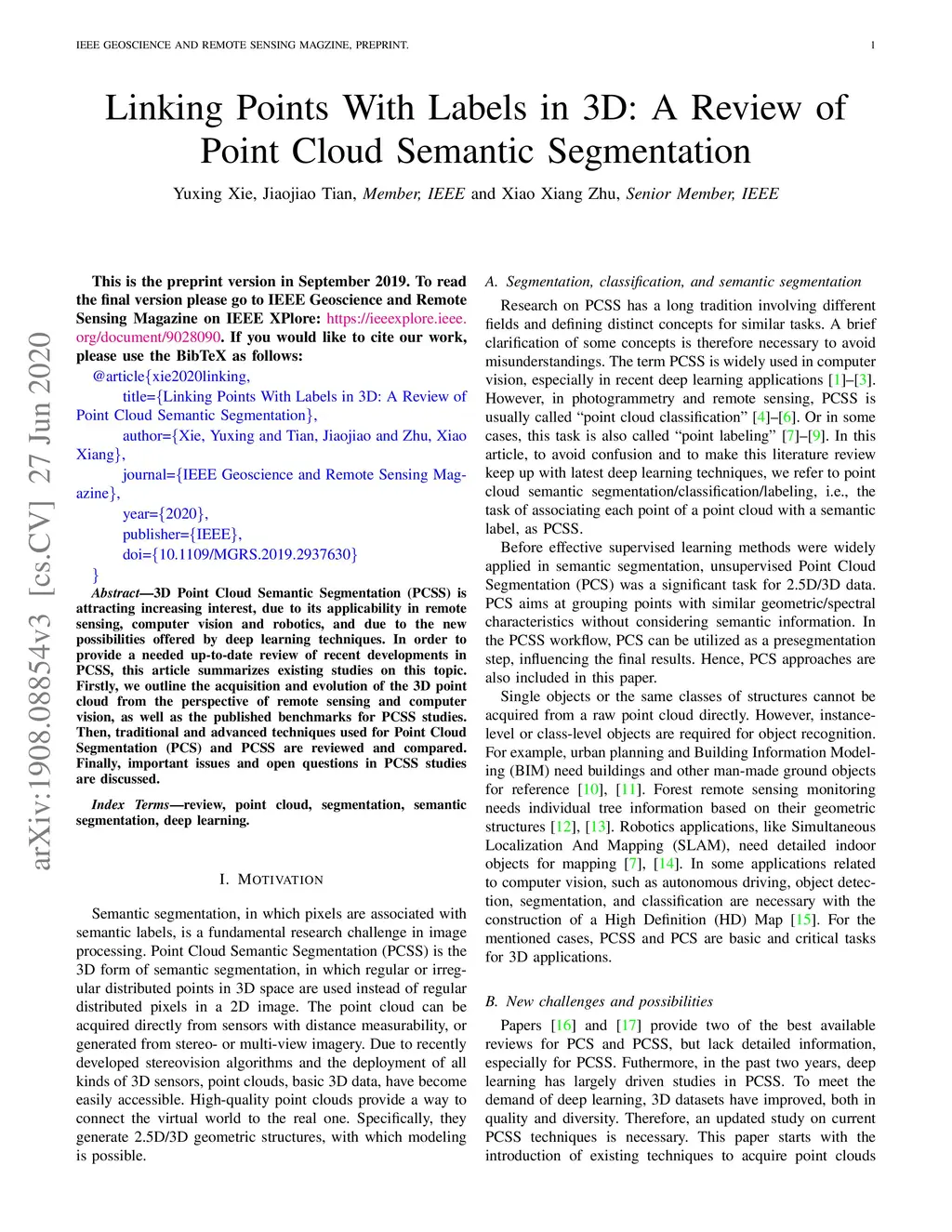 3D Point Cloud Semantic Segmentation (PCSS) is attracting increasing interest, due to its applicability in remote sensing, computer vision and robotics, and due to the new possibilities offered by deep learning techniques. In order to provide a needed up-to-date review of recent developments in PCSS, this article summarizes existing studies on this topic. Firstly, we outline the acquisition and evolution of the 3D point cloud from the perspective of remote sensing and computer vision, as well as the published benchmarks for PCSS studies. Then, traditional and advanced techniques used for Point Cloud Segmentation (PCS) and PCSS are reviewed and compared. Finally, important issues and open questions in PCSS studies are discussed.