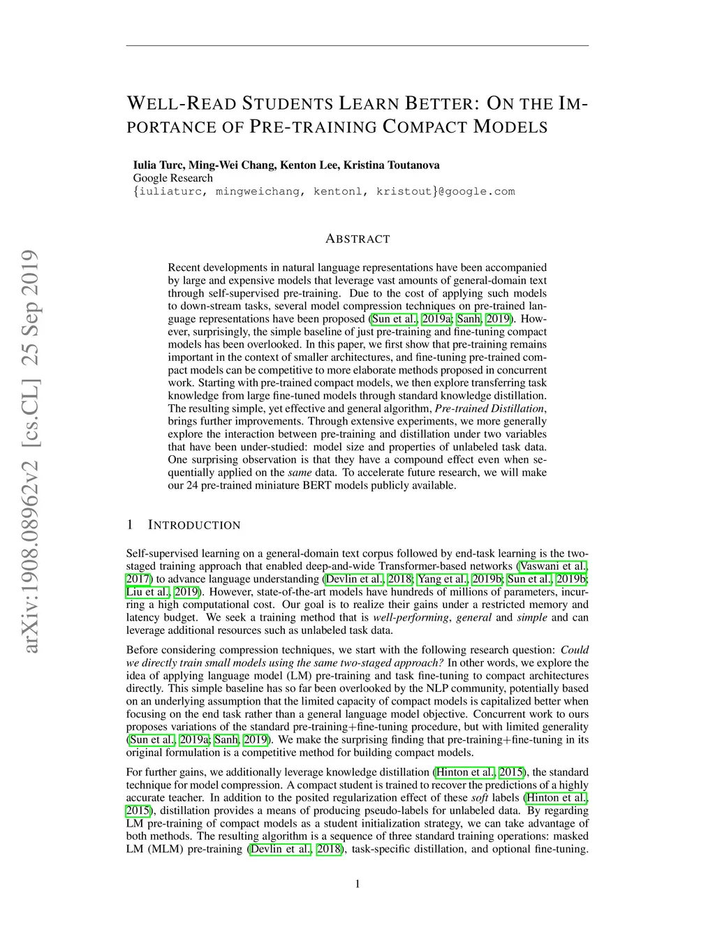 Recent developments in natural language representations have been accompanied by large and expensive models that leverage vast amounts of general-domain text through self-supervised pre-training. Due to the cost of applying such models to down-stream tasks, several model compression techniques on pre-trained language representations have been proposed (Sun et al., 2019; Sanh, 2019). However, surprisingly, the simple baseline of just pre-training and fine-tuning compact models has been overlooked. In this paper, we first show that pre-training remains important in the context of smaller architectures, and fine-tuning pre-trained compact models can be competitive to more elaborate methods proposed in concurrent work. Starting with pre-trained compact models, we then explore transferring task knowledge from large fine-tuned models through standard knowledge distillation. The resulting simple, yet effective and general algorithm, Pre-trained Distillation, brings further improvements. Through extensive experiments, we more generally explore the interaction between pre-training and distillation under two variables that have been under-studied: model size and properties of unlabeled task data. One surprising observation is that they have a compound effect even when sequentially applied on the same data. To accelerate future research, we will make our 24 pre-trained miniature BERT models publicly available.
