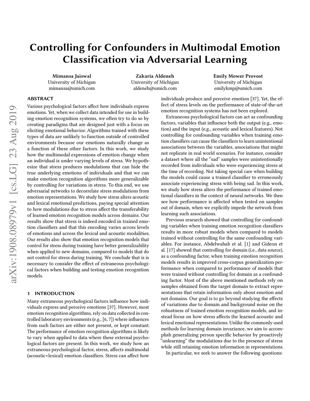 Controlling for Confounders in Multimodal Emotion Classification via