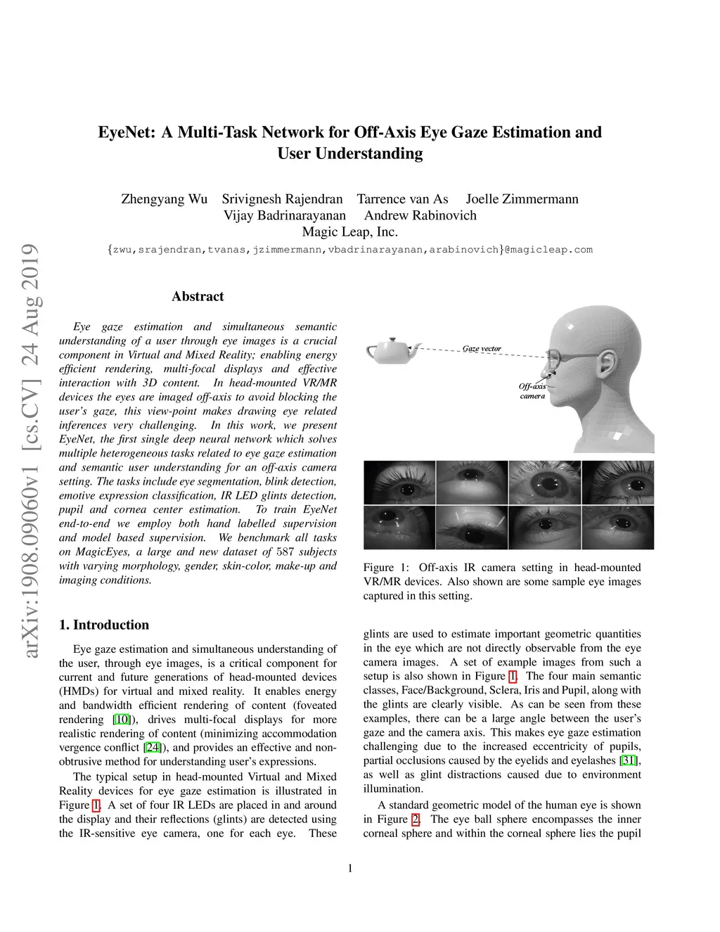 Eye gaze estimation and simultaneous semantic understanding of a user through eye images is a crucial component in Virtual and Mixed Reality; enabling energy efficient rendering, multi-focal displays and effective interaction with 3D content. In head-mounted VR/MR devices the eyes are imaged off-axis to avoid blocking the user's gaze, this view-point makes drawing eye related inferences very challenging. In this work, we present EyeNet, the first single deep neural network which solves multiple heterogeneous tasks related to eye gaze estimation and semantic user understanding for an off-axis camera setting. The tasks include eye segmentation, blink detection, emotive expression classification, IR LED glints detection, pupil and cornea center estimation. To train EyeNet end-to-end we employ both hand labelled supervision and model based supervision. We benchmark all tasks on MagicEyes, a large and new dataset of 587 subjects with varying morphology, gender, skin-color, make-up and imaging conditions.