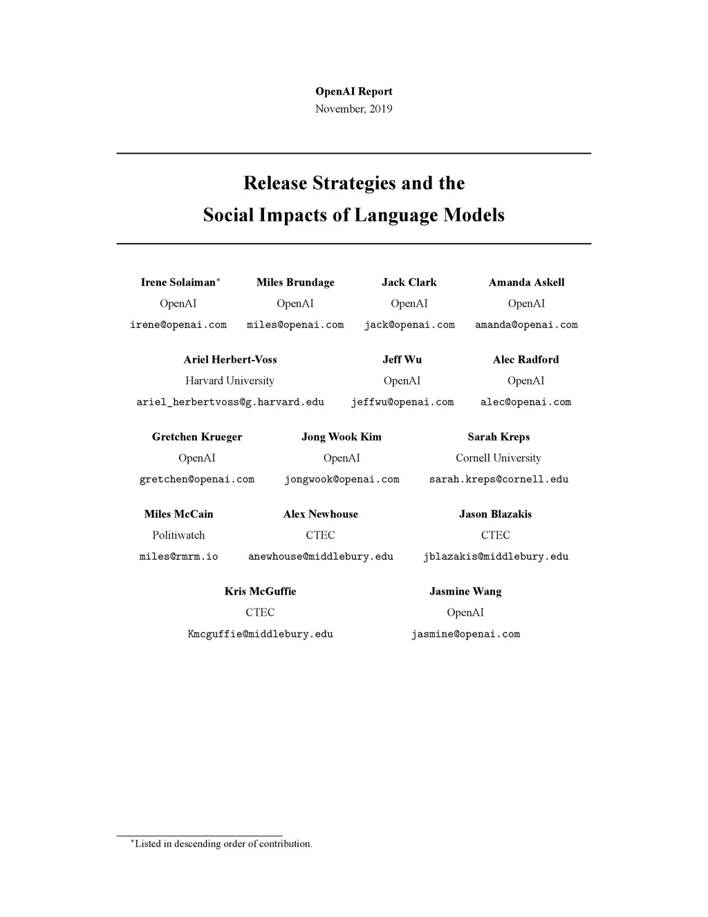 Large language models have a range of beneficial uses: they can assist in prose, poetry, and programming; analyze dataset biases; and more. However, their flexibility and generative capabilities also raise misuse concerns. This report discusses OpenAI's work related to the release of its GPT-2 language model. It discusses staged release, which allows time between model releases to conduct risk and benefit analyses as model sizes increased. It also discusses ongoing partnership-based research and provides recommendations for better coordination and responsible publication in AI.
