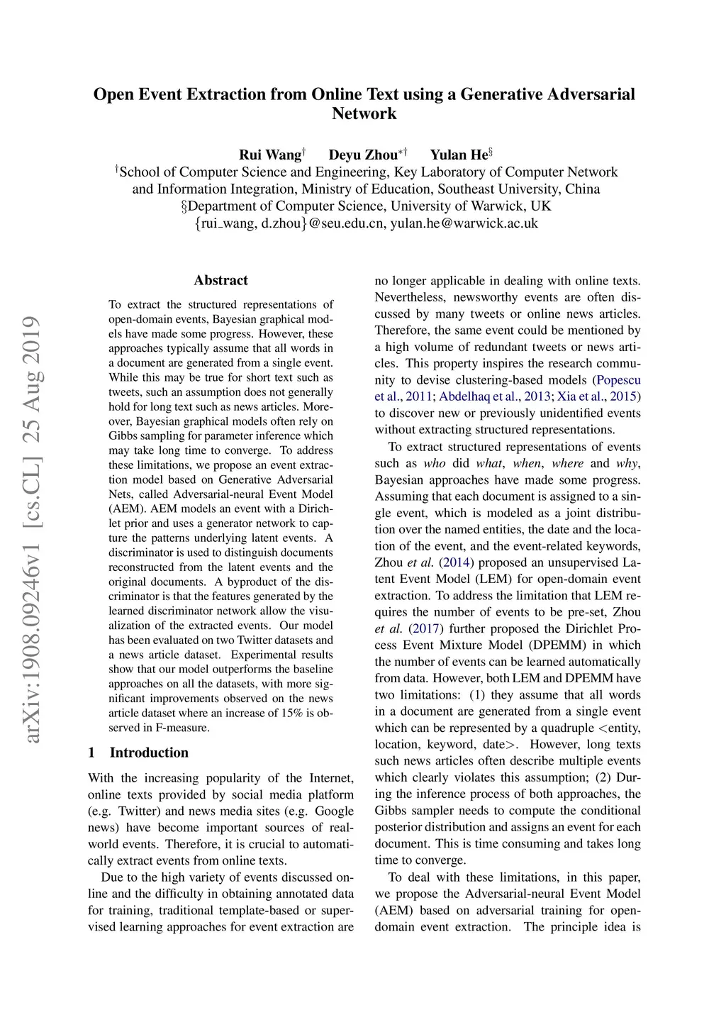 To extract the structured representations of open-domain events, Bayesian graphical models have made some progress. However, these approaches typically assume that all words in a document are generated from a single event. While this may be true for short text such as tweets, such an assumption does not generally hold for long text such as news articles. Moreover, Bayesian graphical models often rely on Gibbs sampling for parameter inference which may take long time to converge. To address these limitations, we propose an event extraction model based on Generative Adversarial Nets, called Adversarial-neural Event Model (AEM). AEM models an event with a Dirichlet prior and uses a generator network to capture the patterns underlying latent events. A discriminator is used to distinguish documents reconstructed from the latent events and the original documents. A byproduct of the discriminator is that the features generated by the learned discriminator network allow the visualization of the extracted events. Our model has been evaluated on two Twitter datasets and a news article dataset. Experimental results show that our model outperforms the baseline approaches on all the datasets, with more significant improvements observed on the news article dataset where an increase of 15\% is observed in F-measure.