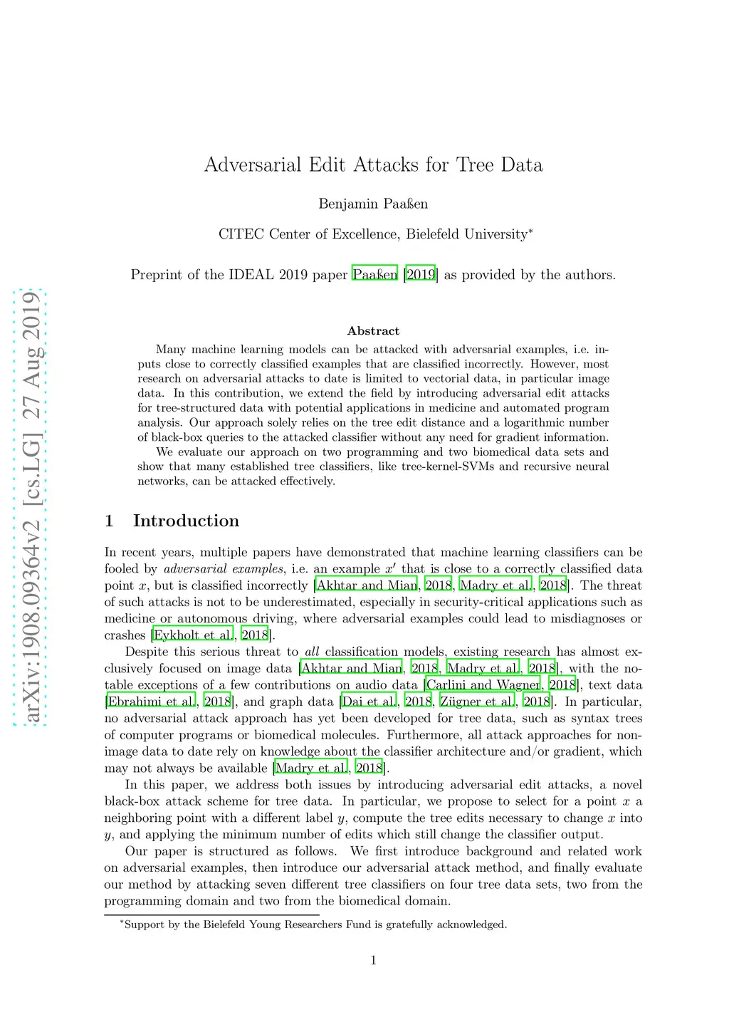 Many machine learning models can be attacked with adversarial examples, i.e. inputs close to correctly classified examples that are classified incorrectly. However, most research on adversarial attacks to date is limited to vectorial data, in particular image data. In this contribution, we extend the field by introducing adversarial edit attacks for tree-structured data with potential applications in medicine and automated program analysis. Our approach solely relies on the tree edit distance and a logarithmic number of black-box queries to the attacked classifier without any need for gradient information. We evaluate our approach on two programming and two biomedical data sets and show that many established tree classifiers, like tree-kernel-SVMs and recursive neural networks, can be attacked effectively.