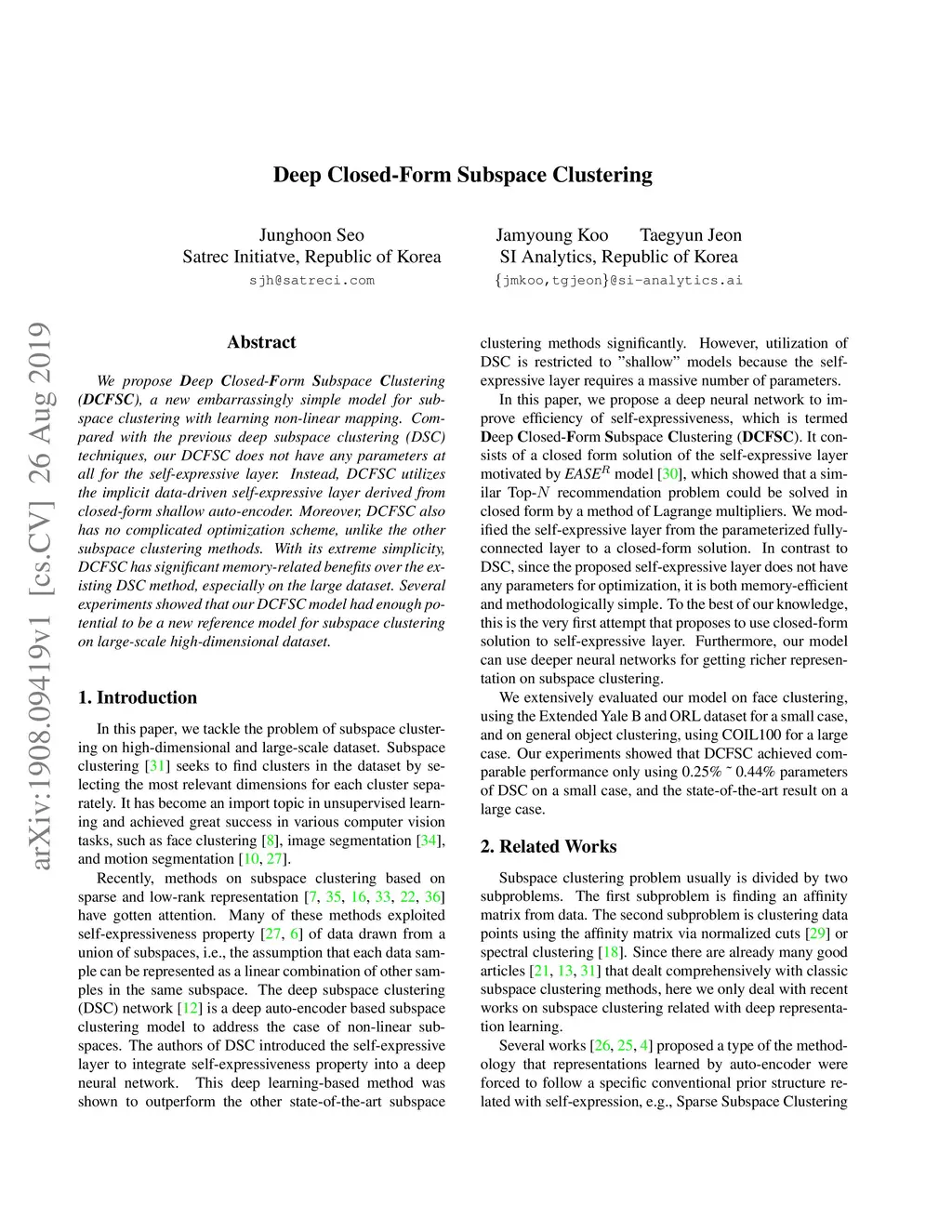 We propose Deep Closed-Form Subspace Clustering (DCFSC), a new embarrassingly simple model for subspace clustering with learning non-linear mapping. Compared with the previous deep subspace clustering (DSC) techniques, our DCFSC does not have any parameters at all for the self-expressive layer. Instead, DCFSC utilizes the implicit data-driven self-expressive layer derived from closed-form shallow auto-encoder. Moreover, DCFSC also has no complicated optimization scheme, unlike the other subspace clustering methods. With its extreme simplicity, DCFSC has significant memory-related benefits over the existing DSC method, especially on the large dataset. Several experiments showed that our DCFSC model had enough potential to be a new reference model for subspace clustering on large-scale high-dimensional dataset.