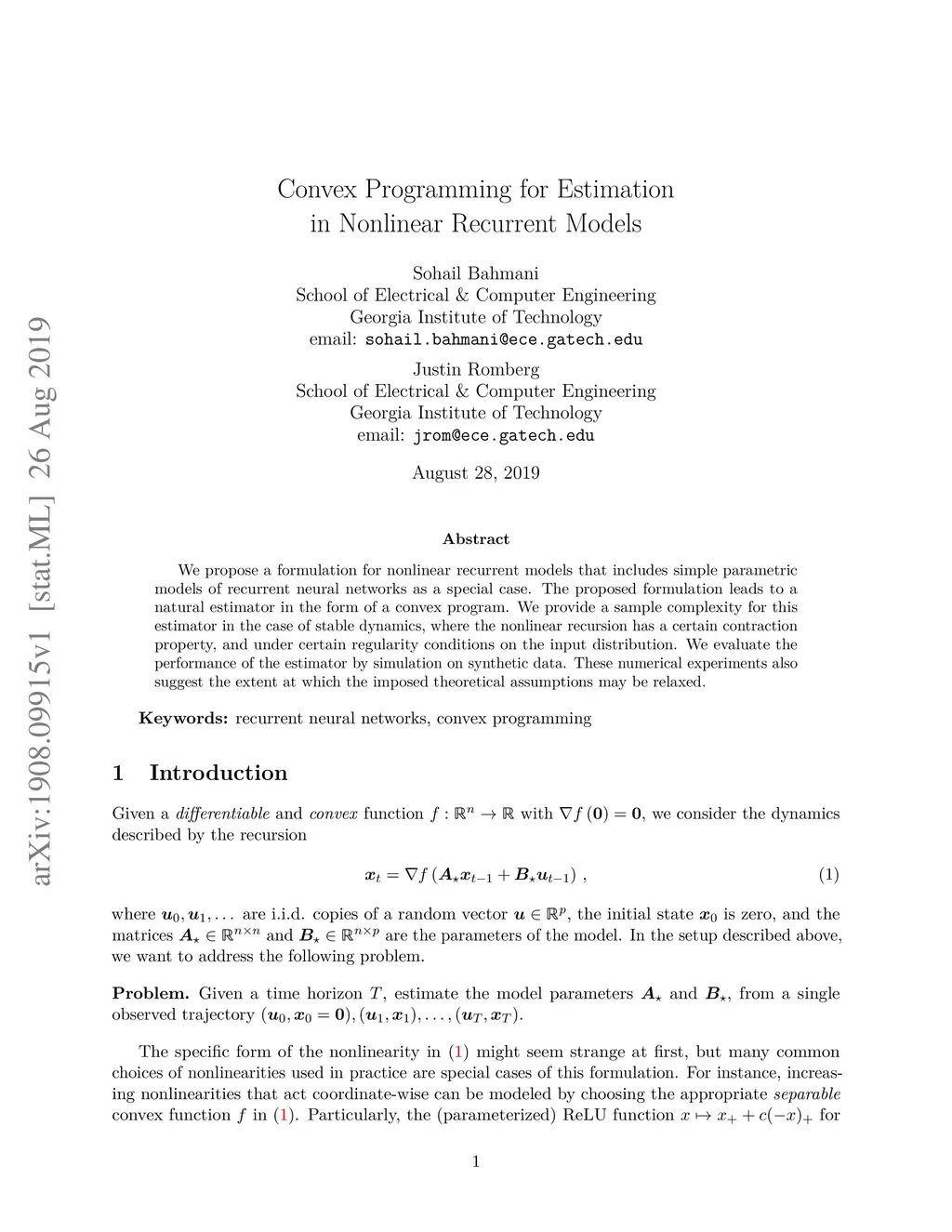 Convex Programming for Estimation in Nonlinear Recurrent Models