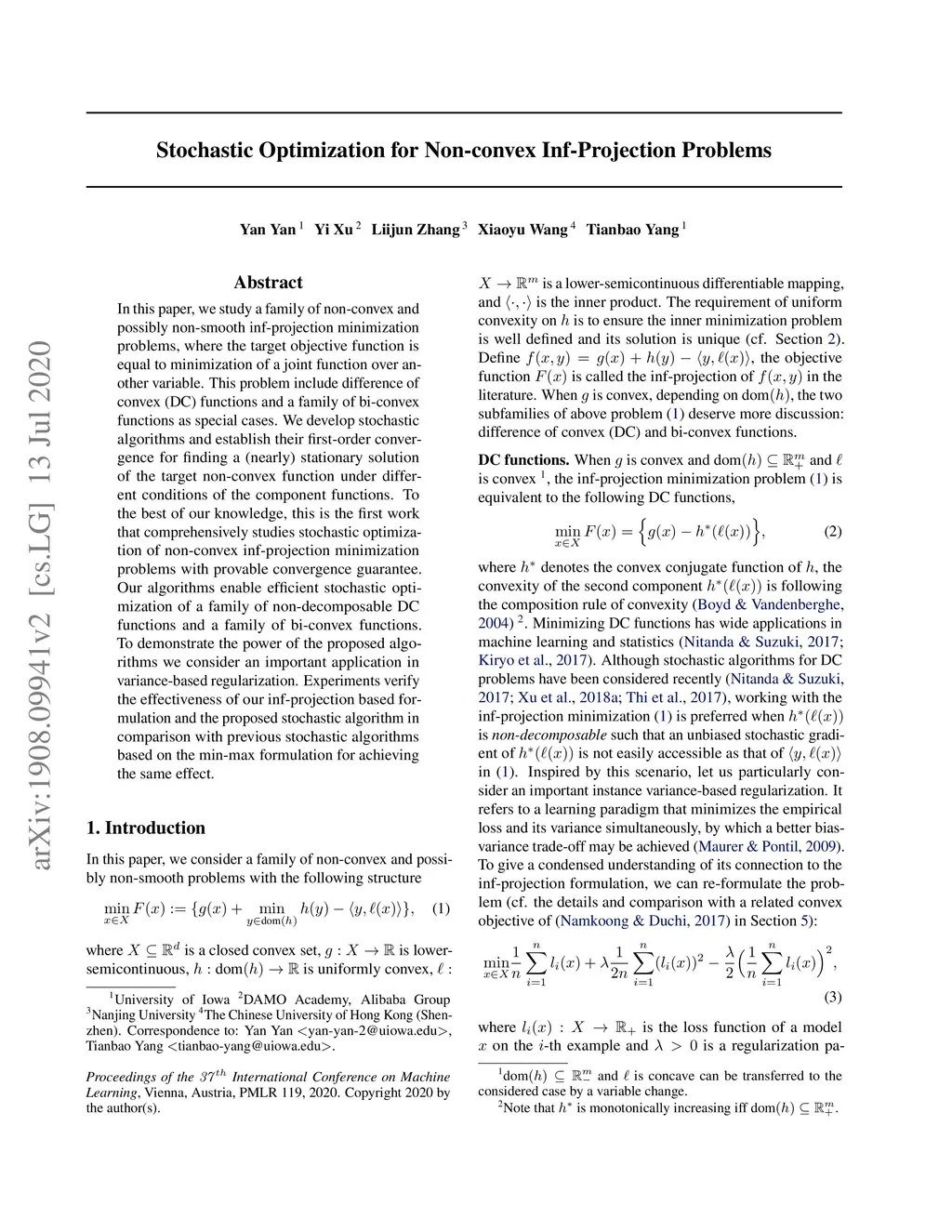 In this paper, we study a family of non-convex and possibly non-smooth inf-projection minimization problems, where the target objective function is equal to minimization of a joint function over another variable. This problem includes difference of convex (DC) functions and a family of bi-convex functions as special cases. We develop stochastic algorithms and establish their first-order convergence for finding a (nearly) stationary solution of the target non-convex function under different conditions of the component functions. To the best of our knowledge, this is the first work that comprehensively studies stochastic optimization of non-convex inf-projection minimization problems with provable convergence guarantee. Our algorithms enable efficient stochastic optimization of a family of non-decomposable DC functions and a family of bi-convex functions. To demonstrate the power of the proposed algorithms we consider an important application in variance-based regularization, and experiments verify the effectiveness of our inf-projection based formulation and the proposed stochastic algorithm in comparison with previous stochastic algorithms based on the min-max formulation for achieving the same effect.