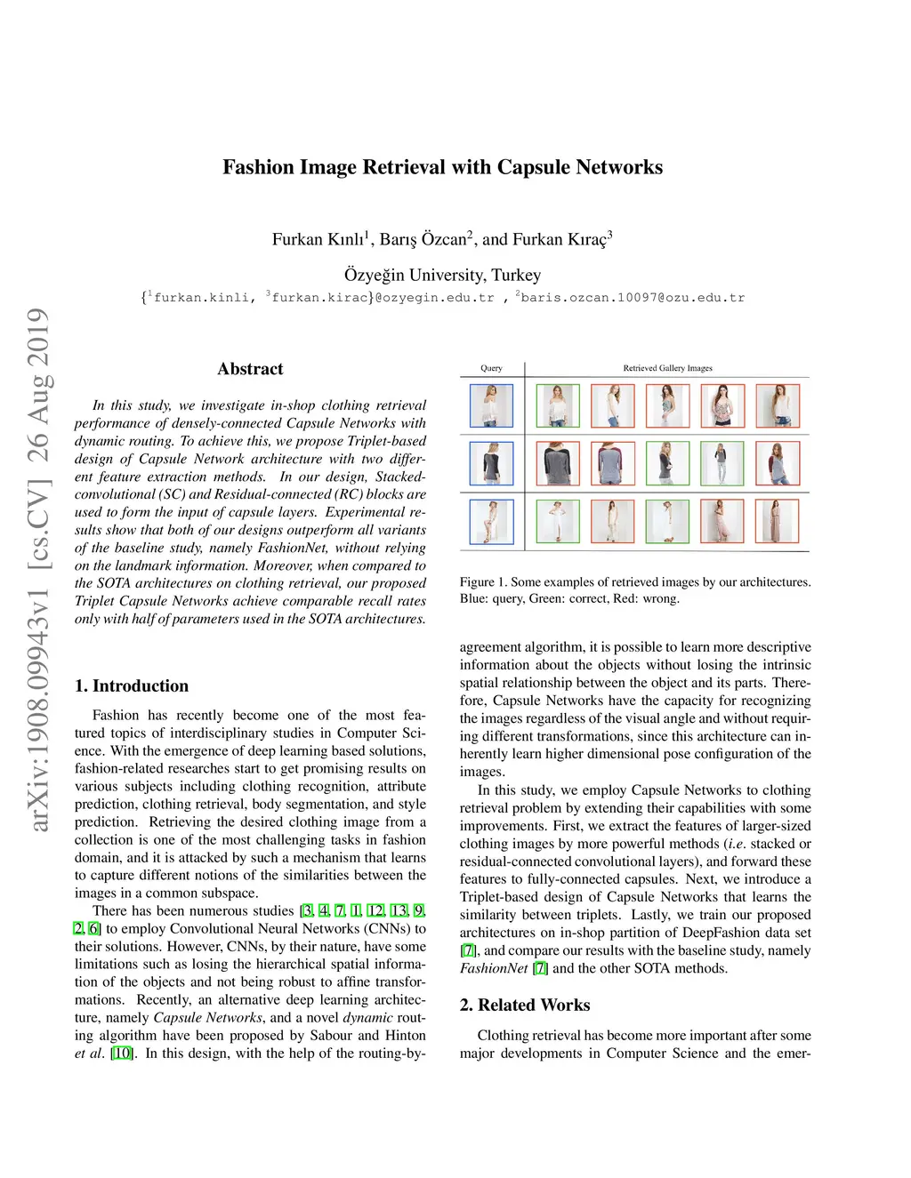 In this study, we investigate in-shop clothing retrieval performance of densely-connected Capsule Networks with dynamic routing. To achieve this, we propose Triplet-based design of Capsule Network architecture with two different feature extraction methods. In our design, Stacked-convolutional (SC) and Residual-connected (RC) blocks are used to form the input of capsule layers. Experimental results show that both of our designs outperform all variants of the baseline study, namely FashionNet, without relying on the landmark information. Moreover, when compared to the SOTA architectures on clothing retrieval, our proposed Triplet Capsule Networks achieve comparable recall rates only with half of parameters used in the SOTA architectures.