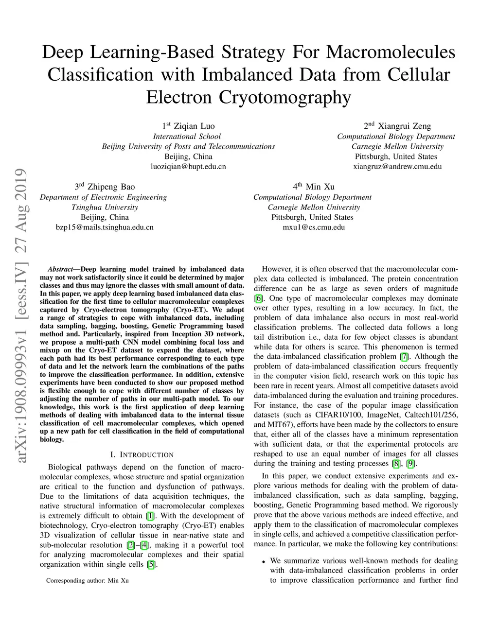 Deep learning model trained by imbalanced data may not work satisfactorily since it could be determined by major classes and thus may ignore the classes with small amount of data. In this paper, we apply deep learning based imbalanced data classification for the first time to cellular macromolecular complexes captured by Cryo-electron tomography (Cryo-ET). We adopt a range of strategies to cope with imbalanced data, including data sampling, bagging, boosting, Genetic Programming based method and. Particularly, inspired from Inception 3D network, we propose a multi-path CNN model combining focal loss and mixup on the Cryo-ET dataset to expand the dataset, where each path had its best performance corresponding to each type of data and let the network learn the combinations of the paths to improve the classification performance. In addition, extensive experiments have been conducted to show our proposed method is flexible enough to cope with different number of classes by adjusting the number of paths in our multi-path model. To our knowledge, this work is the first application of deep learning methods of dealing with imbalanced data to the internal tissue classification of cell macromolecular complexes, which opened up a new path for cell classification in the field of computational biology.