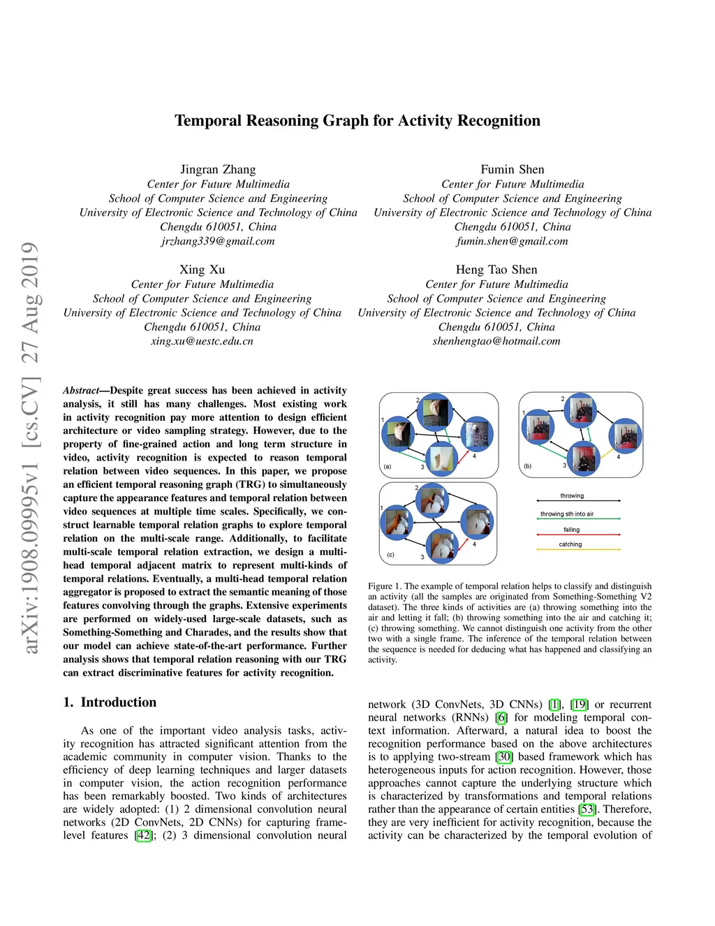 Despite great success has been achieved in activity analysis, it still has many challenges. Most existing work in activity recognition pay more attention to design efficient architecture or video sampling strategy. However, due to the property of fine-grained action and long term structure in video, activity recognition is expected to reason temporal relation between video sequences. In this paper, we propose an efficient temporal reasoning graph (TRG) to simultaneously capture the appearance features and temporal relation between video sequences at multiple time scales. Specifically, we construct learnable temporal relation graphs to explore temporal relation on the multi-scale range. Additionally, to facilitate multi-scale temporal relation extraction, we design a multi-head temporal adjacent matrix to represent multi-kinds of temporal relations. Eventually, a multi-head temporal relation aggregator is proposed to extract the semantic meaning of those features convolving through the graphs. Extensive experiments are performed on widely-used large-scale datasets, such as Something-Something and Charades, and the results show that our model can achieve state-of-the-art performance. Further analysis shows that temporal relation reasoning with our TRG can extract discriminative features for activity recognition.