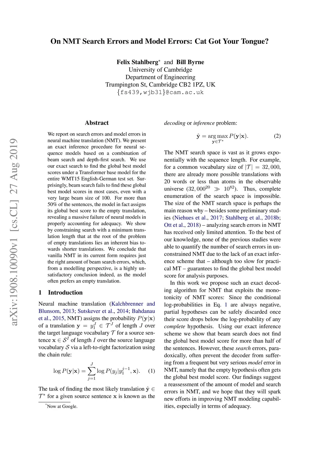 We report on search errors and model errors in neural machine translation (NMT). We present an exact inference procedure for neural sequence models based on a combination of beam search and depth-first search. We use our exact search to find the global best model scores under a Transformer base model for the entire WMT15 English-German test set. Surprisingly, beam search fails to find these global best model scores in most cases, even with a very large beam size of 100. For more than 50% of the sentences, the model in fact assigns its global best score to the empty translation, revealing a massive failure of neural models in properly accounting for adequacy. We show by constraining search with a minimum translation length that at the root of the problem of empty translations lies an inherent bias towards shorter translations. We conclude that vanilla NMT in its current form requires just the right amount of beam search errors, which, from a modelling perspective, is a highly unsatisfactory conclusion indeed, as the model often prefers an empty translation.
