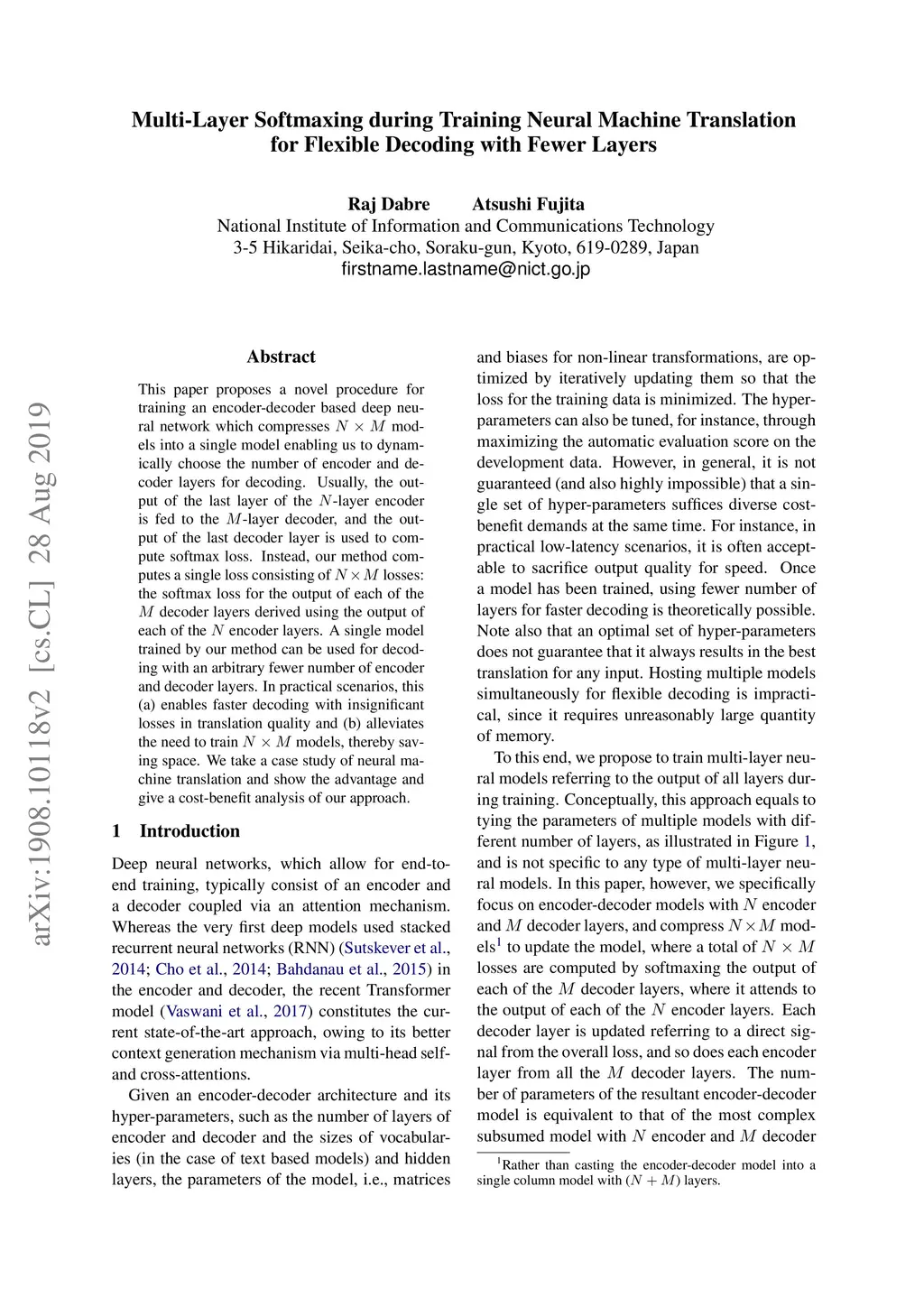 This paper proposes a novel procedure for training an encoder-decoder based deep neural network which compresses NxM models into a single model enabling us to dynamically choose the number of encoder and decoder layers for decoding. Usually, the output of the last layer of the N-layer encoder is fed to the M-layer decoder, and the output of the last decoder layer is used to compute softmax loss. Instead, our method computes a single loss consisting of NxM losses: the softmax loss for the output of each of the M decoder layers derived using the output of each of the N encoder layers. A single model trained by our method can be used for decoding with an arbitrary fewer number of encoder and decoder layers. In practical scenarios, this (a) enables faster decoding with insignificant losses in translation quality and (b) alleviates the need to train NxM models, thereby saving space. We take a case study of neural machine translation and show the advantage and give a cost-benefit analysis of our approach.