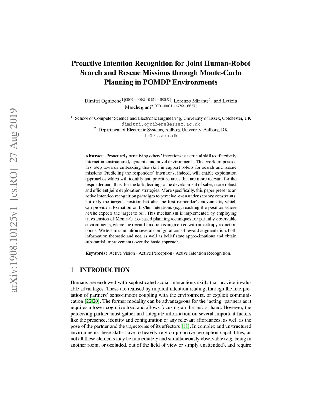 Proactively perceiving others' intentions is a crucial skill to effectively interact in unstructured, dynamic and novel environments. This work proposes a first step towards embedding this skill in support robots for search and rescue missions. Predicting the responders' intentions, indeed, will enable exploration approaches which will identify and prioritise areas that are more relevant for the responder and, thus, for the task, leading to the development of safer, more robust and efficient joint exploration strategies. More specifically, this paper presents an active intention recognition paradigm to perceive, even under sensory constraints, not only the target's position but also the first responder's movements, which can provide information on his/her intentions (e.g. reaching the position where he/she expects the target to be). This mechanism is implemented by employing an extension of Monte-Carlo-based planning techniques for partially observable environments, where the reward function is augmented with an entropy reduction bonus. We test in simulation several configurations of reward augmentation, both information theoretic and not, as well as belief state approximations and obtain substantial improvements over the basic approach.