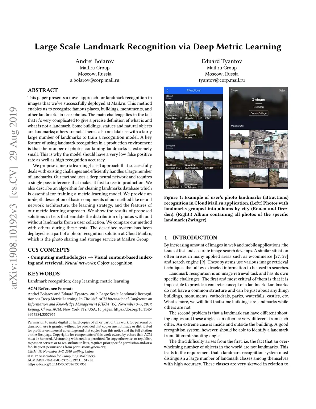 This paper presents a novel approach for landmark recognition in images that we've successfully deployed at Mail ru. This method enables us to recognize famous places, buildings, monuments, and other landmarks in user photos. The main challenge lies in the fact that it's very complicated to give a precise definition of what is and what is not a landmark. Some buildings, statues and natural objects are landmarks; others are not. There's also no database with a fairly large number of landmarks to train a recognition model. A key feature of using landmark recognition in a production environment is that the number of photos containing landmarks is extremely small. This is why the model should have a very low false positive rate as well as high recognition accuracy. We propose a metric learning-based approach that successfully deals with existing challenges and efficiently handles a large number of landmarks. Our method uses a deep neural network and requires a single pass inference that makes it fast to use in production. We also describe an algorithm for cleaning landmarks database which is essential for training a metric learning model. We provide an in-depth description of basic components of our method like neural network architecture, the learning strategy, and the features of our metric learning approach. We show the results of proposed solutions in tests that emulate the distribution of photos with and without landmarks from a user collection. We compare our method with others during these tests. The described system has been deployed as a part of a photo recognition solution at Cloud Mail ru, which is the photo sharing and storage service at Mail ru Group.