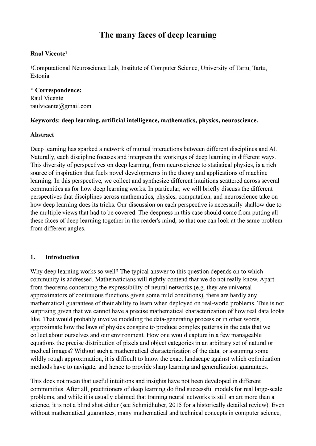 Deep learning has sparked a network of mutual interactions between different disciplines and AI. Naturally, each discipline focuses and interprets the workings of deep learning in different ways. This diversity of perspectives on deep learning, from neuroscience to statistical physics, is a rich source of inspiration that fuels novel developments in the theory and applications of machine learning. In this perspective, we collect and synthesize different intuitions scattered across several communities as for how deep learning works. In particular, we will briefly discuss the different perspectives that disciplines across mathematics, physics, computation, and neuroscience take on how deep learning does its tricks. Our discussion on each perspective is necessarily shallow due to the multiple views that had to be covered. The deepness in this case should come from putting all these faces of deep learning together in the reader's mind, so that one can look at the same problem from different angles.
