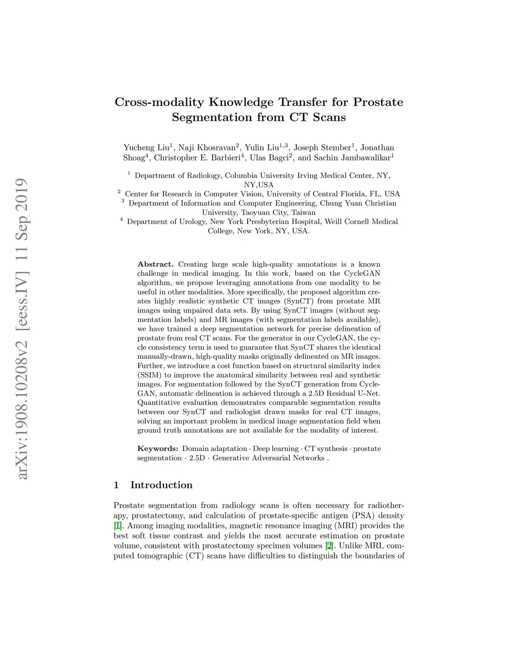 Creating large scale high-quality annotations is a known challenge in medical imaging. In this work, based on the CycleGAN algorithm, we propose leveraging annotations from one modality to be useful in other modalities. More specifically, the proposed algorithm creates highly realistic synthetic CT images (SynCT) from prostate MR images using unpaired data sets. By using SynCT images (without segmentation labels) and MR images (with segmentation labels available), we have trained a deep segmentation network for precise delineation of prostate from real CT scans. For the generator in our CycleGAN, the cycle consistency term is used to guarantee that SynCT shares the identical manually-drawn, high-quality masks originally delineated on MR images. Further, we introduce a cost function based on structural similarity index (SSIM) to improve the anatomical similarity between real and synthetic images. For segmentation followed by the SynCT generation from CycleGAN, automatic delineation is achieved through a 2.5D Residual U-Net. Quantitative evaluation demonstrates comparable segmentation results between our SynCT and radiologist drawn masks for real CT images, solving an important problem in medical image segmentation field when ground truth annotations are not available for the modality of interest.