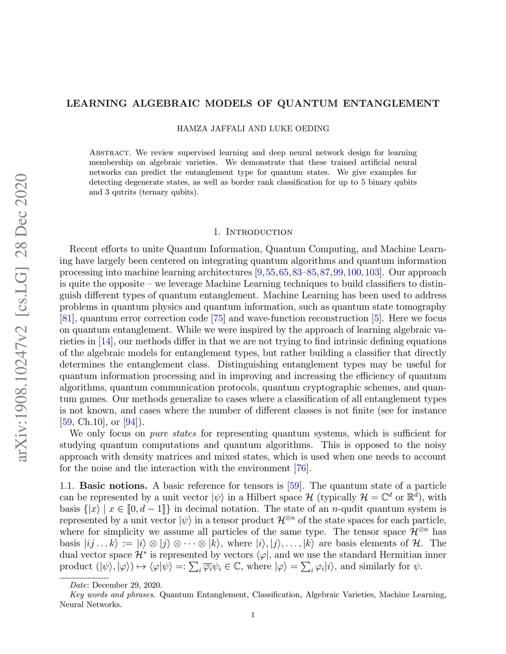 We review supervised learning and deep neural network design for learning membership on algebraic varieties. We demonstrate that these trained artificial neural networks can predict the entanglement type for quantum states. We give examples for detecting degenerate states, as well as border rank classification for up to 5 binary qubits and 3 qutrits (ternary qubits).