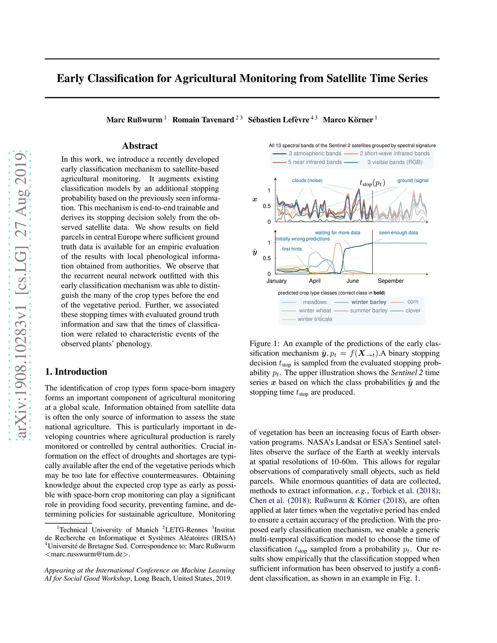 In this work, we introduce a recently developed early classification mechanism to satellite-based agricultural monitoring. It augments existing classification models by an additional stopping probability based on the previously seen information. This mechanism is end-to-end trainable and derives its stopping decision solely from the observed satellite data. We show results on field parcels in central Europe where sufficient ground truth data is available for an empiric evaluation of the results with local phenological information obtained from authorities. We observe that the recurrent neural network outfitted with this early classification mechanism was able to distinguish the many of the crop types before the end of the vegetative period. Further, we associated these stopping times with evaluated ground truth information and saw that the times of classification were related to characteristic events of the observed plants' phenology.