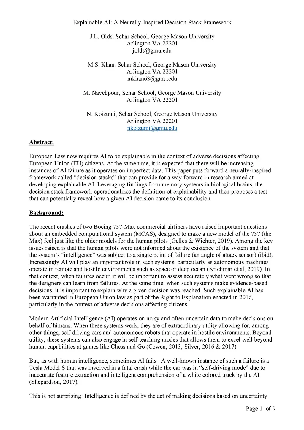 European Law now requires AI to be explainable in the context of adverse decisions affecting European Union (EU) citizens. At the same time, it is expected that there will be increasing instances of AI failure as it operates on imperfect data. This paper puts forward a neurally-inspired framework called decision stacks that can provide for a way forward in research aimed at developing explainable AI. Leveraging findings from memory systems in biological brains, the decision stack framework operationalizes the definition of explainability and then proposes a test that can potentially reveal how a given AI decision came to its conclusion.