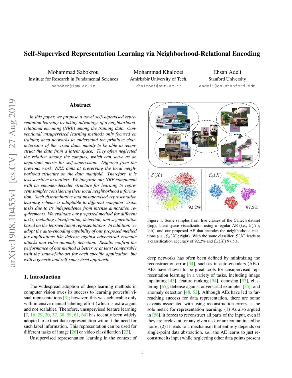 In this paper, we propose a novel self-supervised representation learning by taking advantage of a neighborhood-relational encoding (NRE) among the training data. Conventional unsupervised learning methods only focused on training deep networks to understand the primitive characteristics of the visual data, mainly to be able to reconstruct the data from a latent space. They often neglected the relation among the samples, which can serve as an important metric for self-supervision. Different from the previous work, NRE aims at preserving the local neighborhood structure on the data manifold. Therefore, it is less sensitive to outliers. We integrate our NRE component with an encoder-decoder structure for learning to represent samples considering their local neighborhood information. Such discriminative and unsupervised representation learning scheme is adaptable to different computer vision tasks due to its independence from intense annotation requirements. We evaluate our proposed method for different tasks, including classification, detection, and segmentation based on the learned latent representations. In addition, we adopt the auto-encoding capability of our proposed method for applications like defense against adversarial example attacks and video anomaly detection. Results confirm the performance of our method is better or at least comparable with the state-of-the-art for each specific application, but with a generic and self-supervised approach.