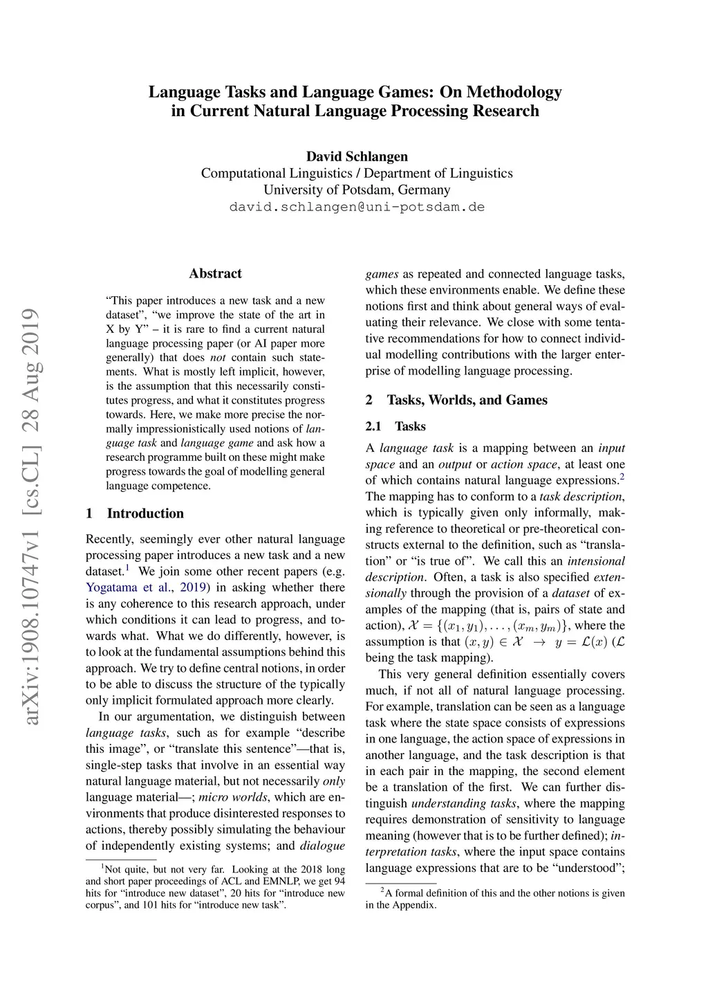 "This paper introduces a new task and a new dataset", "we improve the state of the art in X by Y" -- it is rare to find a current natural language processing paper (or AI paper more generally) that does not contain such statements. What is mostly left implicit, however, is the assumption that this necessarily constitutes progress, and what it constitutes progress towards. Here, we make more precise the normally impressionistically used notions of language task and language game and ask how a research programme built on these might make progress towards the goal of modelling general language competence.