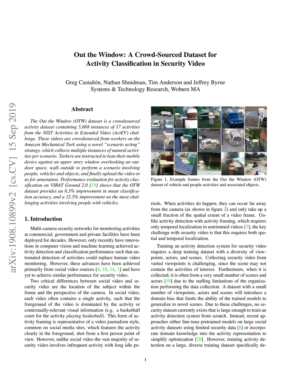 The Out the Window (OTW) dataset is a crowdsourced activity dataset containing 5,668 instances of 17 activities from the NIST Activities in Extended Video (ActEV) challenge. These videos are crowdsourced from workers on the Amazon Mechanical Turk using a novel scenario acting strategy, which collects multiple instances of natural activities per scenario. Turkers are instructed to lean their mobile device against an upper story window overlooking an outdoor space, walk outside to perform a scenario involving people, vehicles and objects, and finally upload the video to us for annotation. Performance evaluation for activity classification on VIRAT Ground 2.0 shows that the OTW dataset provides an 8.3% improvement in mean classification accuracy, and a 12.5% improvement on the most challenging activities involving people with vehicles.