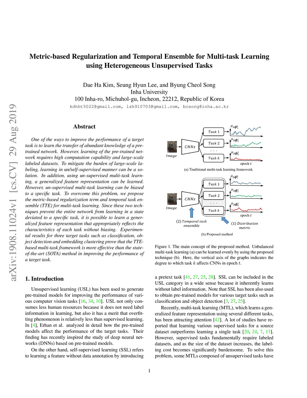 One of the ways to improve the performance of a target task is to learn the transfer of abundant knowledge of a pre-trained network. However, learning of the pre-trained network requires high computation capability and large-scale labeled dataset. To mitigate the burden of large-scale labeling, learning in un/self-supervised manner can be a solution. In addition, using unsupervised multi-task learning, a generalized feature representation can be learned. However, unsupervised multi-task learning can be biased to a specific task. To overcome this problem, we propose the metric-based regularization term and temporal task ensemble (TTE) for multi-task learning. Since these two techniques prevent the entire network from learning in a state deviated to a specific task, it is possible to learn a generalized feature representation that appropriately reflects the characteristics of each task without biasing. Experimental results for three target tasks such as classification, object detection and embedding clustering prove that the TTE-based multi-task framework is more effective than the state-of-the-art (SOTA) method in improving the performance of a target task.
