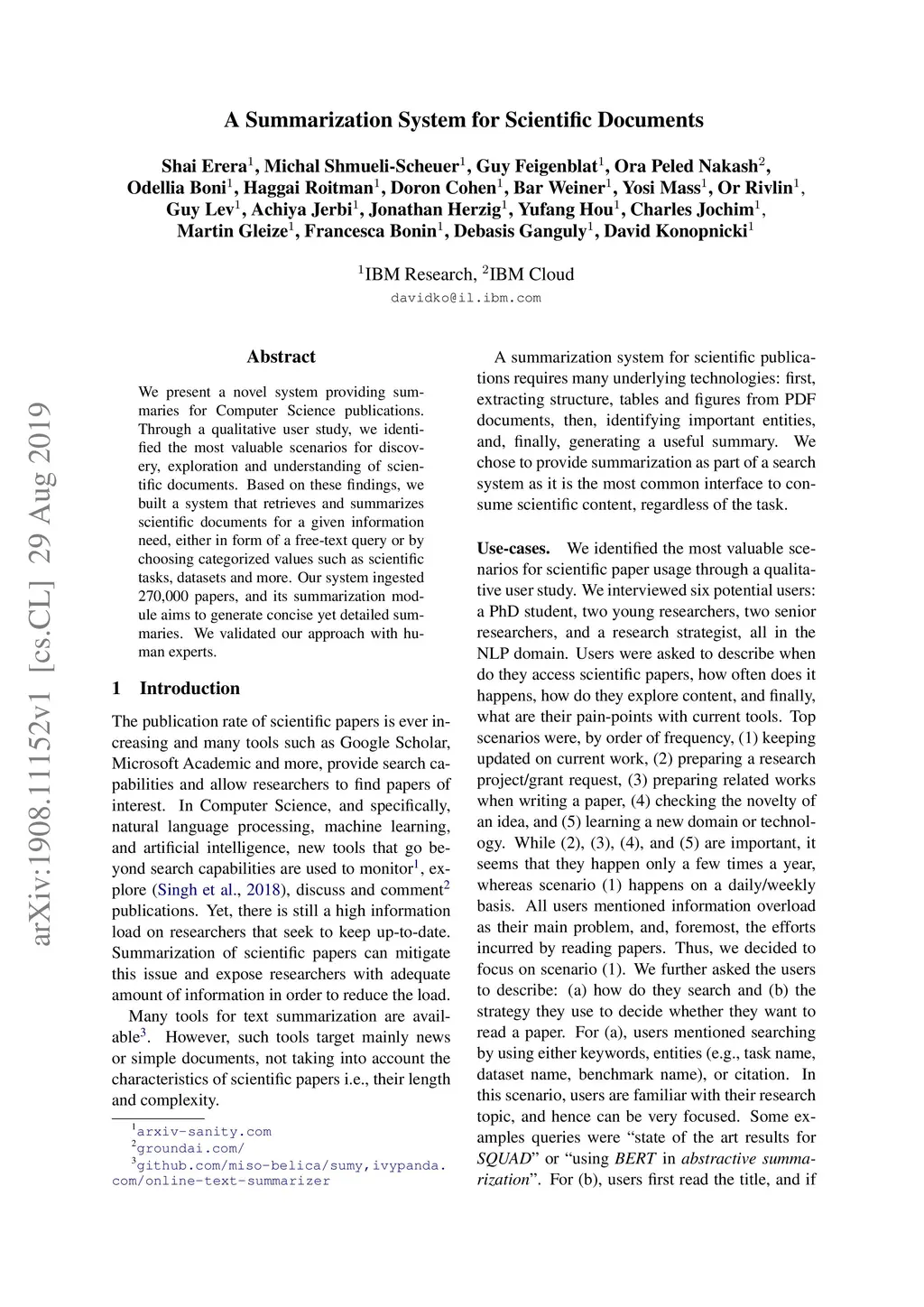 We present a novel system providing summaries for Computer Science publications. Through a qualitative user study, we identified the most valuable scenarios for discovery, exploration and understanding of scientific documents. Based on these findings, we built a system that retrieves and summarizes scientific documents for a given information need, either in form of a free-text query or by choosing categorized values such as scientific tasks, datasets and more. Our system ingested 270,000 papers, and its summarization module aims to generate concise yet detailed summaries. We validated our approach with human experts.