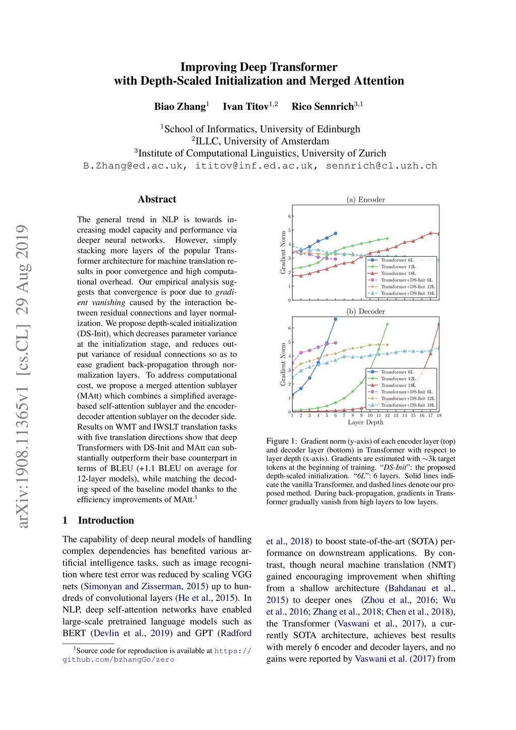 Improving Deep Transformer with Depth-Scaled Initialization and Merged