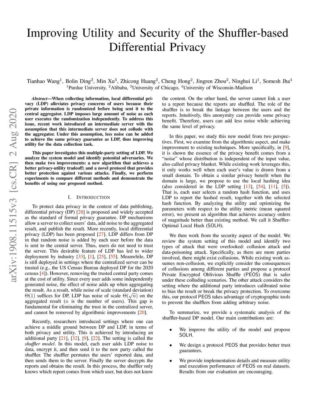 When collecting information, local differential privacy (LDP) alleviates privacy concerns of users because their private information is randomized before being sent it to the central aggregator. LDP imposes large amount of noise as each user executes the randomization independently. To address this issue, recent work introduced an intermediate server with the assumption that this intermediate server does not collude with the aggregator. Under this assumption, less noise can be added to achieve the same privacy guarantee as LDP, thus improving utility for the data collection task. This paper investigates this multiple-party setting of LDP. We analyze the system model and identify potential adversaries. We then make two improvements: a new algorithm that achieves a better privacy-utility tradeoff; and a novel protocol that provides better protection against various attacks. Finally, we perform experiments to compare different methods and demonstrate the benefits of using our proposed method.