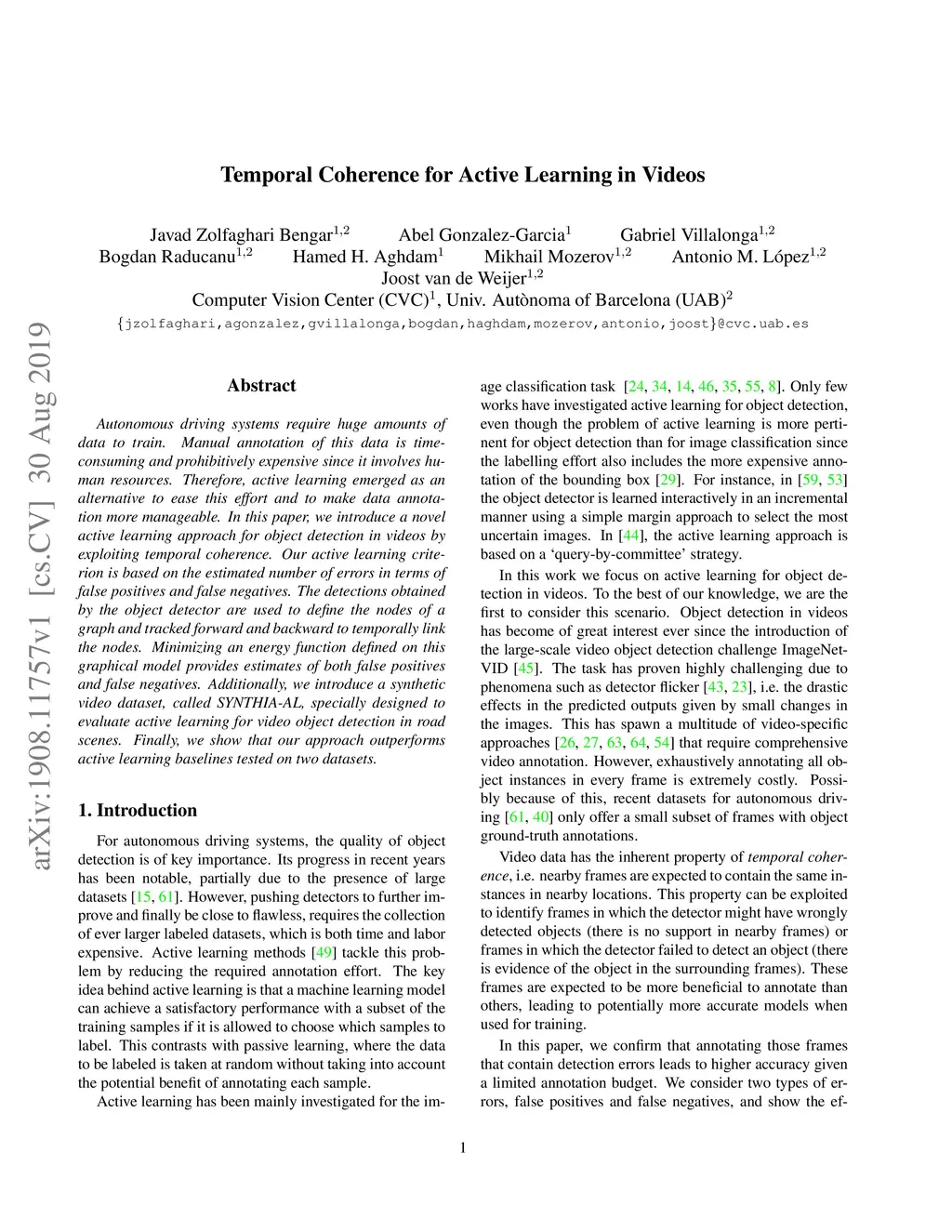 Autonomous driving systems require huge amounts of data to train. Manual annotation of this data is time-consuming and prohibitively expensive since it involves human resources. Therefore, active learning emerged as an alternative to ease this effort and to make data annotation more manageable. In this paper, we introduce a novel active learning approach for object detection in videos by exploiting temporal coherence. Our active learning criterion is based on the estimated number of errors in terms of false positives and false negatives. The detections obtained by the object detector are used to define the nodes of a graph and tracked forward and backward to temporally link the nodes. Minimizing an energy function defined on this graphical model provides estimates of both false positives and false negatives. Additionally, we introduce a synthetic video dataset, called SYNTHIA-AL, specially designed to evaluate active learning for video object detection in road scenes. Finally, we show that our approach outperforms active learning baselines tested on two datasets.