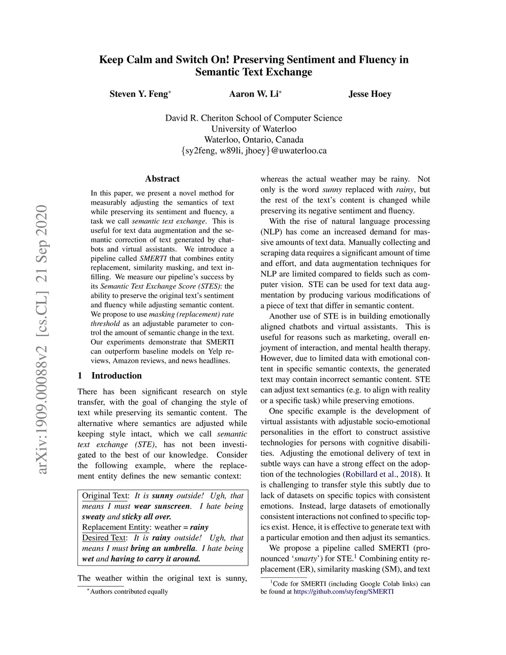 In this paper, we present a novel method for measurably adjusting the semantics of text while preserving its sentiment and fluency, a task we call semantic text exchange. This is useful for text data augmentation and the semantic correction of text generated by chatbots and virtual assistants. We introduce a pipeline called SMERTI that combines entity replacement, similarity masking, and text infilling. We measure our pipeline's success by its Semantic Text Exchange Score (STES): the ability to preserve the original text's sentiment and fluency while adjusting semantic content. We propose to use masking (replacement) rate threshold as an adjustable parameter to control the amount of semantic change in the text. Our experiments demonstrate that SMERTI can outperform baseline models on Yelp reviews, Amazon reviews, and news headlines.