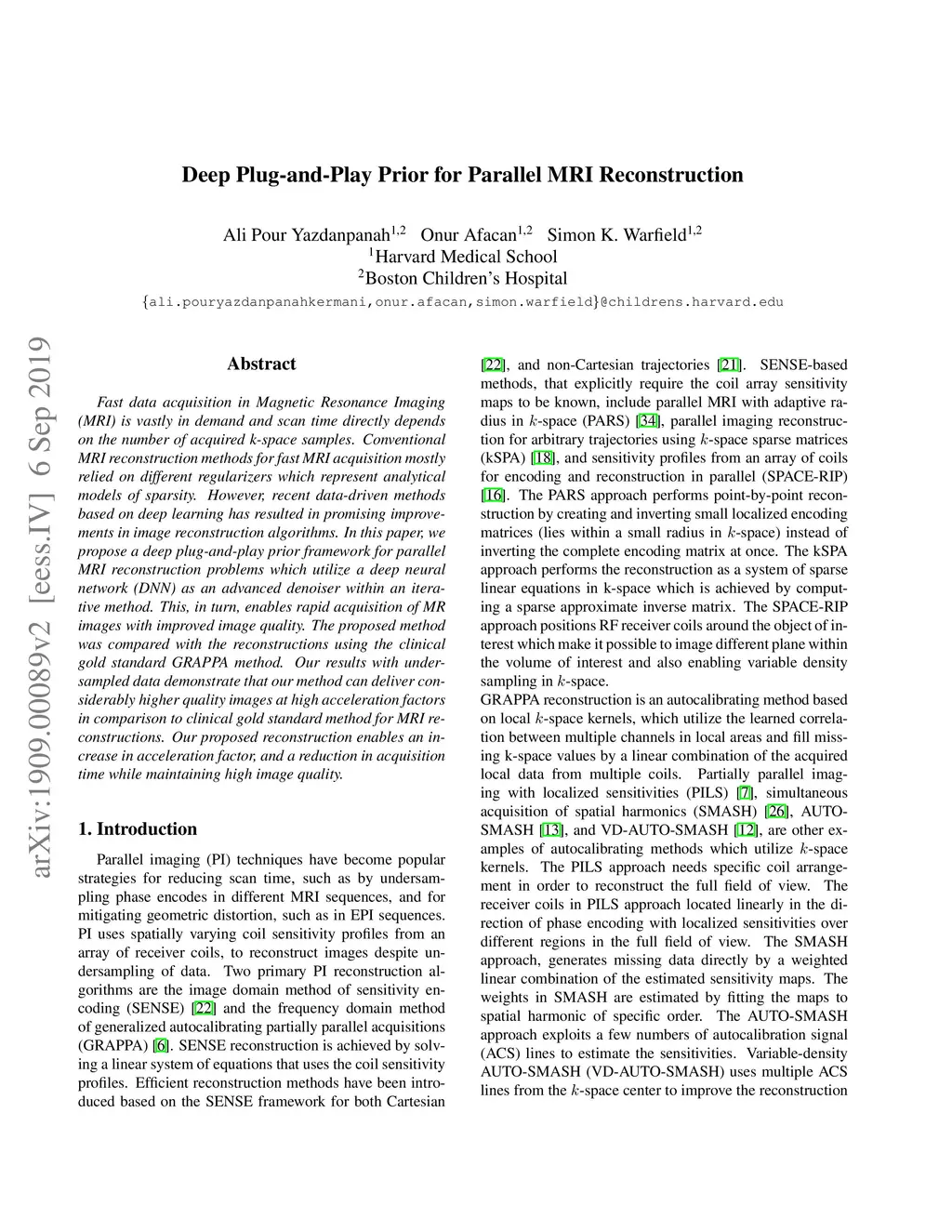 Fast data acquisition in Magnetic Resonance Imaging (MRI) is vastly in demand and scan time directly depends on the number of acquired k-space samples. Conventional MRI reconstruction methods for fast MRI acquisition mostly relied on different regularizers which represent analytical models of sparsity. However, recent data-driven methods based on deep learning has resulted in promising improvements in image reconstruction algorithms. In this paper, we propose a deep plug-and-play prior framework for parallel MRI reconstruction problems which utilize a deep neural network (DNN) as an advanced denoiser within an iterative method. This, in turn, enables rapid acquisition of MR images with improved image quality. The proposed method was compared with the reconstructions using the clinical gold standard GRAPPA method. Our results with undersampled data demonstrate that our method can deliver considerably higher quality images at high acceleration factors in comparison to clinical gold standard method for MRI reconstructions. Our proposed reconstruction enables an increase in acceleration factor, and a reduction in acquisition time while maintaining high image quality.
