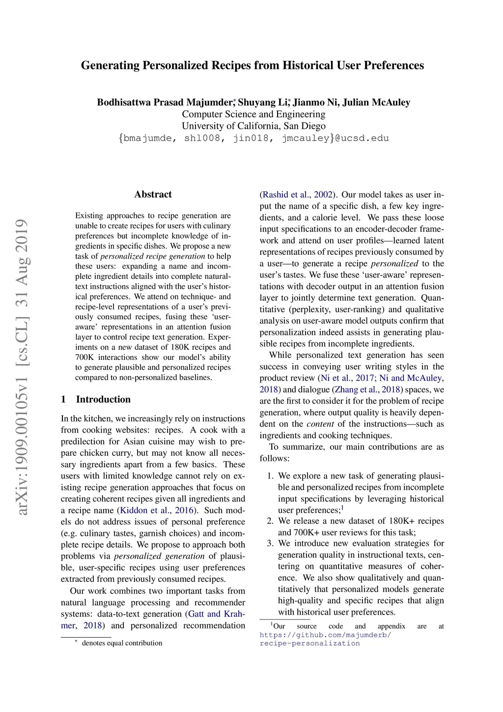 Generating Personalized Recipes from Historical User Preferences