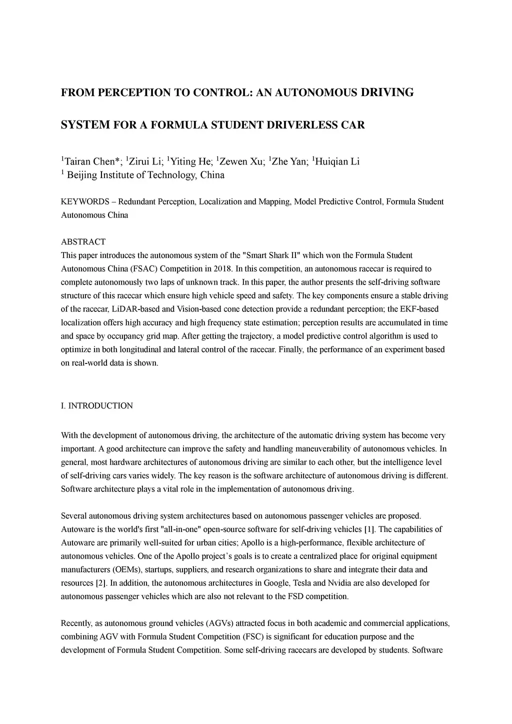 This paper introduces the autonomous system of the "Smart Shark II" which won the Formula Student Autonomous China (FSAC) Competition in 2018. In this competition, an autonomous racecar is required to complete autonomously two laps of unknown track. In this paper, the author presents the self-driving software structure of this racecar which ensure high vehicle speed and safety. The key components ensure a stable driving of the racecar, LiDAR-based and Vision-based cone detection provide a redundant perception; the EKF-based localization offers high accuracy and high frequency state estimation; perception results are accumulated in time and space by occupancy grid map. After getting the trajectory, a model predictive control algorithm is used to optimize in both longitudinal and lateral control of the racecar. Finally, the performance of an experiment based on real-world data is shown.