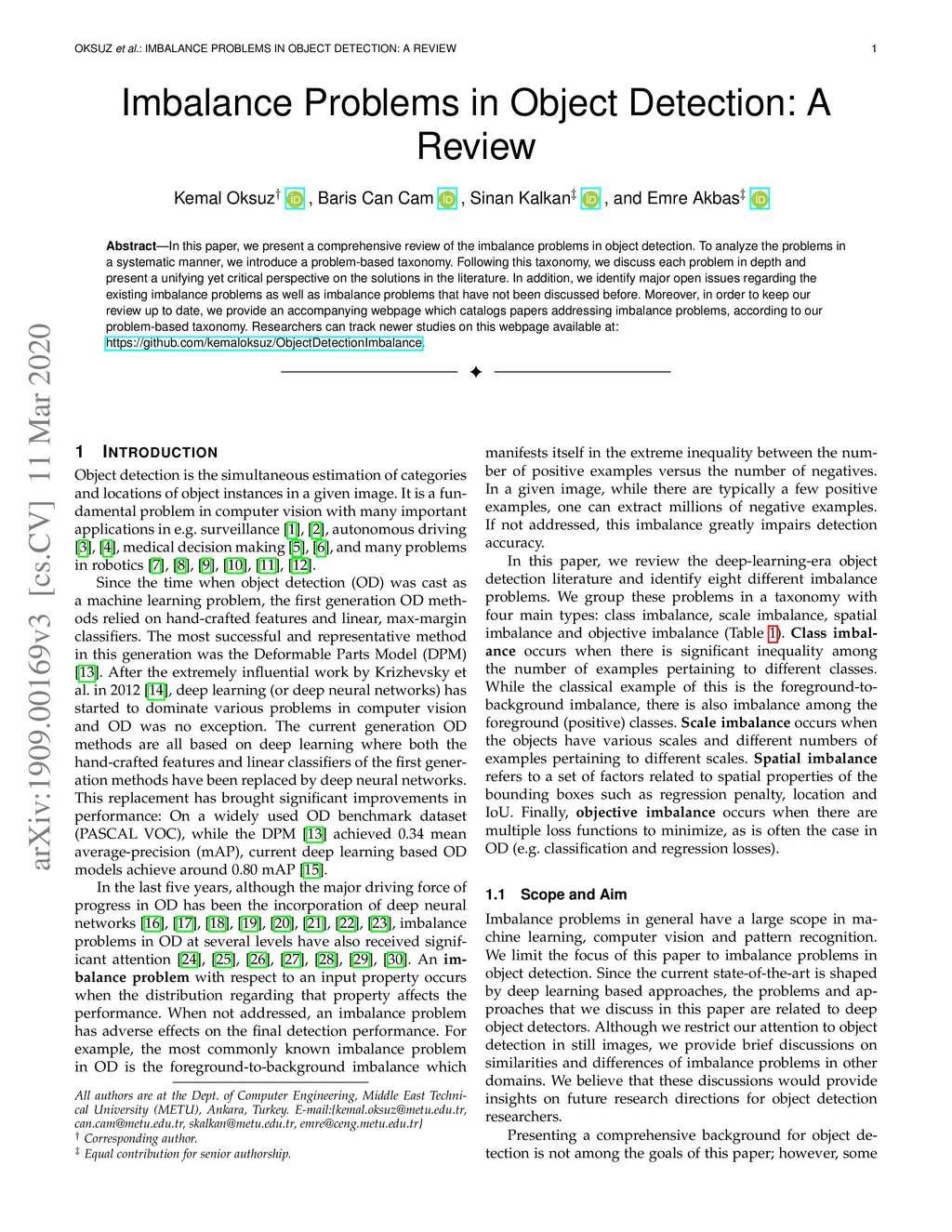 In this paper, we present a comprehensive review of the imbalance problems in object detection. To analyze the problems in a systematic manner, we introduce a problem-based taxonomy. Following this taxonomy, we discuss each problem in depth and present a unifying yet critical perspective on the solutions in the literature. In addition, we identify major open issues regarding the existing imbalance problems as well as imbalance problems that have not been discussed before. Moreover, in order to keep our review up to date, we provide an accompanying webpage which catalogs papers addressing imbalance problems, according to our problem-based taxonomy. Researchers can track newer studies on this webpage available at: https://github.com/kemaloksuz/ObjectDetectionImbalance .