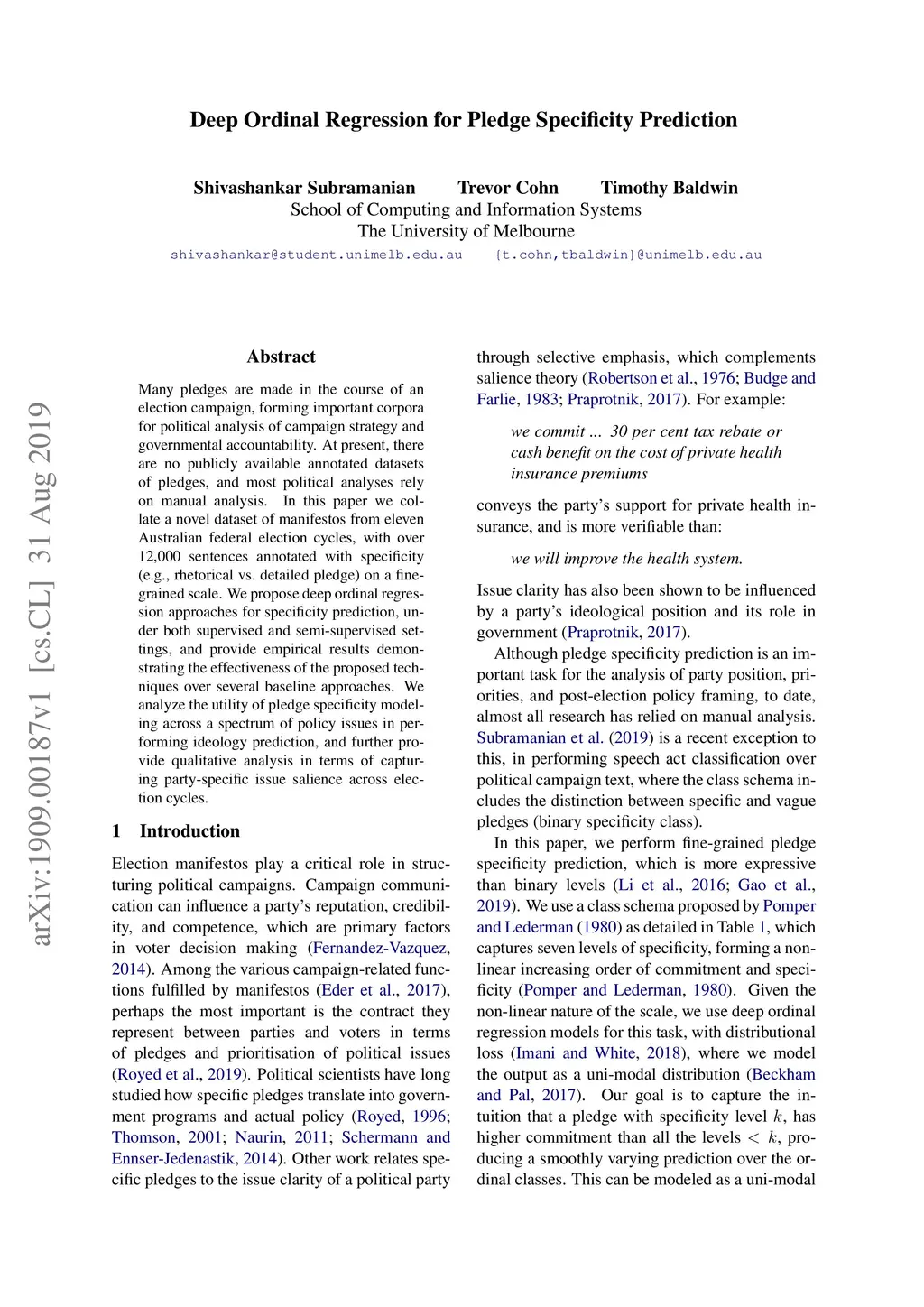 Many pledges are made in the course of an election campaign, forming important corpora for political analysis of campaign strategy and governmental accountability. At present, there are no publicly available annotated datasets of pledges, and most political analyses rely on manual analysis. In this paper we collate a novel dataset of manifestos from eleven Australian federal election cycles, with over 12,000 sentences annotated with specificity (e.g., rhetorical vs.\ detailed pledge) on a fine-grained scale. We propose deep ordinal regression approaches for specificity prediction, under both supervised and semi-supervised settings, and provide empirical results demonstrating the effectiveness of the proposed techniques over several baseline approaches. We analyze the utility of pledge specificity modeling across a spectrum of policy issues in performing ideology prediction, and further provide qualitative analysis in terms of capturing party-specific issue salience across election cycles.