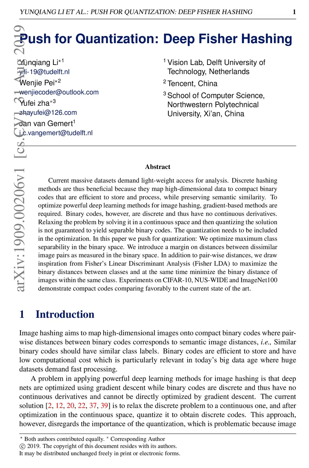 Current massive datasets demand light-weight access for analysis. Discrete hashing methods are thus beneficial because they map high-dimensional data to compact binary codes that are efficient to store and process, while preserving semantic similarity. To optimize powerful deep learning methods for image hashing, gradient-based methods are required. Binary codes, however, are discrete and thus have no continuous derivatives. Relaxing the problem by solving it in a continuous space and then quantizing the solution is not guaranteed to yield separable binary codes. The quantization needs to be included in the optimization. In this paper we push for quantization: We optimize maximum class separability in the binary space. We introduce a margin on distances between dissimilar image pairs as measured in the binary space. In addition to pair-wise distances, we draw inspiration from Fisher's Linear Discriminant Analysis (Fisher LDA) to maximize the binary distances between classes and at the same time minimize the binary distance of images within the same class. Experiments on CIFAR-10, NUS-WIDE and ImageNet100 demonstrate compact codes comparing favorably to the current state of the art.