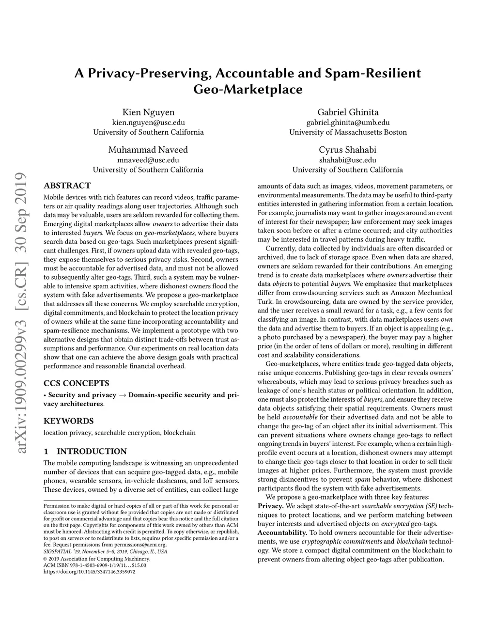 A Privacy-Preserving, Accountable and Spam-Resilient Geo-Marketplace