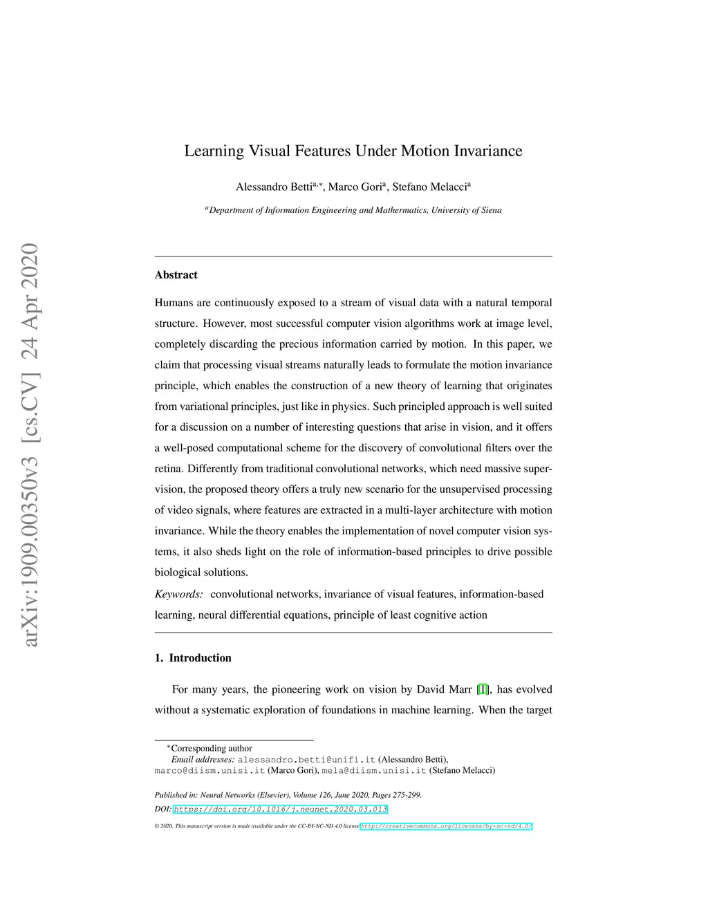 Humans are continuously exposed to a stream of visual data with a natural temporal structure. However, most successful computer vision algorithms work at image level, completely discarding the precious information carried by motion. In this paper, we claim that processing visual streams naturally leads to formulate the motion invariance principle, which enables the construction of a new theory of learning that originates from variational principles, just like in physics. Such principled approach is well suited for a discussion on a number of interesting questions that arise in vision, and it offers a well-posed computational scheme for the discovery of convolutional filters over the retina. Differently from traditional convolutional networks, which need massive supervision, the proposed theory offers a truly new scenario for the unsupervised processing of video signals, where features are extracted in a multi-layer architecture with motion invariance. While the theory enables the implementation of novel computer vision systems, it also sheds light on the role of information-based principles to drive possible biological solutions.