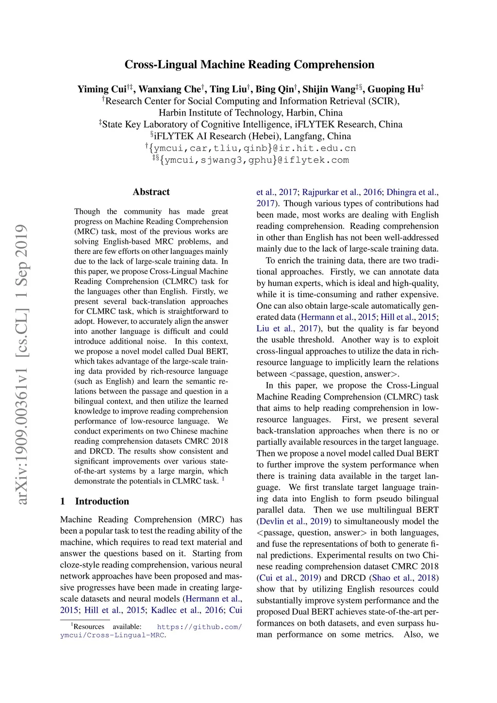 Though the community has made great progress on Machine Reading Comprehension (MRC) task, most of the previous works are solving English-based MRC problems, and there are few efforts on other languages mainly due to the lack of large-scale training data. In this paper, we propose Cross-Lingual Machine Reading Comprehension (CLMRC) task for the languages other than English. Firstly, we present several back-translation approaches for CLMRC task, which is straightforward to adopt. However, to accurately align the answer into another language is difficult and could introduce additional noise. In this context, we propose a novel model called Dual BERT, which takes advantage of the large-scale training data provided by rich-resource language (such as English) and learn the semantic relations between the passage and question in a bilingual context, and then utilize the learned knowledge to improve reading comprehension performance of low-resource language. We conduct experiments on two Chinese machine reading comprehension datasets CMRC 2018 and DRCD. The results show consistent and significant improvements over various state-of-the-art systems by a large margin, which demonstrate the potentials in CLMRC task. Resources available: https://github.com/ymcui/Cross-Lingual-MRC