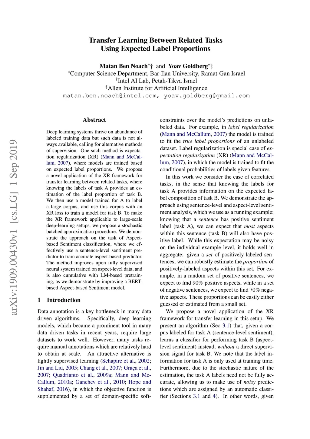 Deep learning systems thrive on abundance of labeled training data but such data is not always available, calling for alternative methods of supervision. One such method is expectation regularization (XR) (Mann and McCallum, 2007), where models are trained based on expected label proportions. We propose a novel application of the XR framework for transfer learning between related tasks, where knowing the labels of task A provides an estimation of the label proportion of task B. We then use a model trained for A to label a large corpus, and use this corpus with an XR loss to train a model for task B. To make the XR framework applicable to large-scale deep-learning setups, we propose a stochastic batched approximation procedure. We demonstrate the approach on the task of Aspect-based Sentiment classification, where we effectively use a sentence-level sentiment predictor to train accurate aspect-based predictor. The method improves upon fully supervised neural system trained on aspect-level data, and is also cumulative with LM-based pretraining, as we demonstrate by improving a BERT-based Aspect-based Sentiment model.