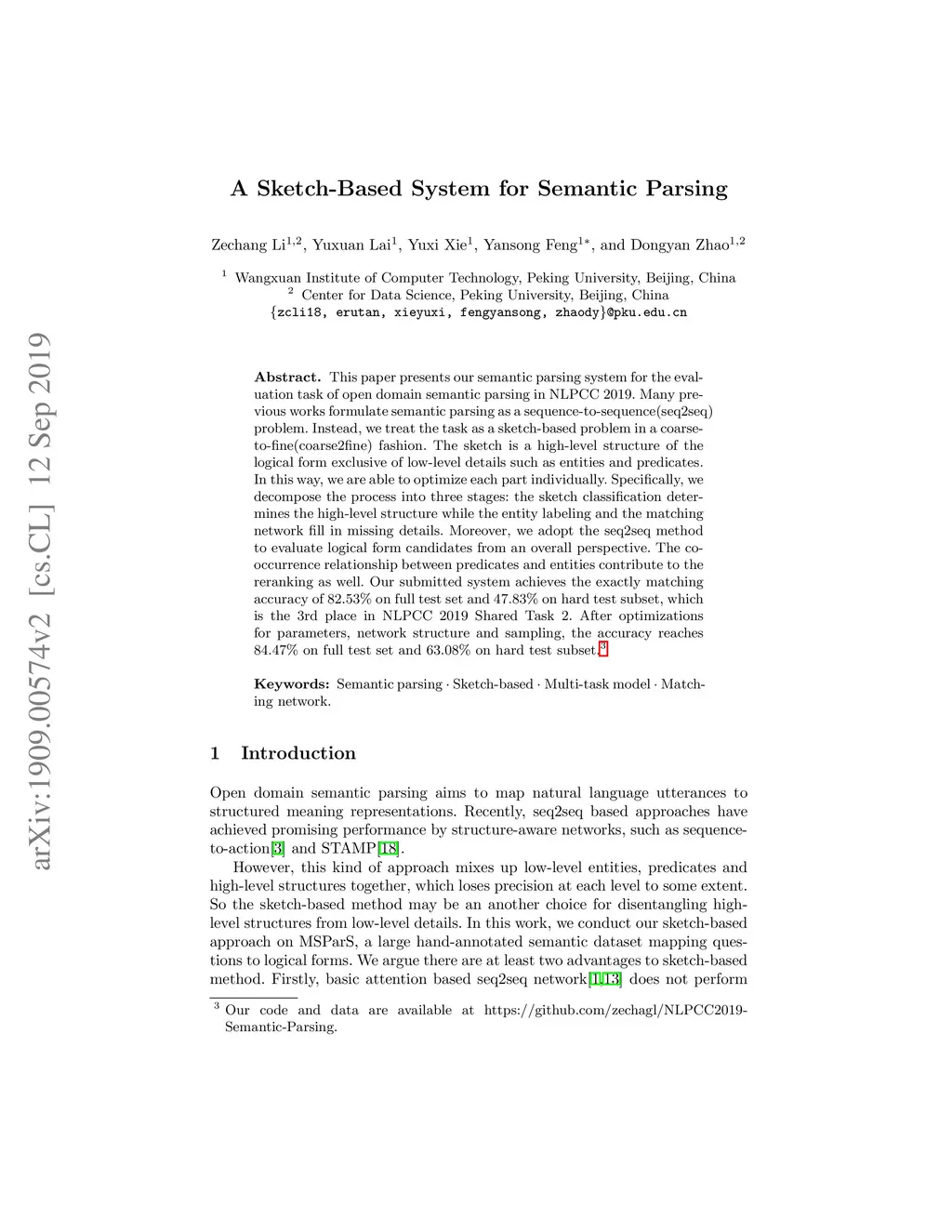 This paper presents our semantic parsing system for the evaluation task of open domain semantic parsing in NLPCC 2019. Many previous works formulate semantic parsing as a sequence-to-sequence(seq2seq) problem. Instead, we treat the task as a sketch-based problem in a coarse-to-fine(coarse2fine) fashion. The sketch is a high-level structure of the logical form exclusive of low-level details such as entities and predicates. In this way, we are able to optimize each part individually. Specifically, we decompose the process into three stages: the sketch classification determines the high-level structure while the entity labeling and the matching network fill in missing details. Moreover, we adopt the seq2seq method to evaluate logical form candidates from an overall perspective. The co-occurrence relationship between predicates and entities contribute to the reranking as well. Our submitted system achieves the exactly matching accuracy of 82.53% on full test set and 47.83% on hard test subset, which is the 3rd place in NLPCC 2019 Shared Task 2. After optimizations for parameters, network structure and sampling, the accuracy reaches 84.47% on full test set and 63.08% on hard test subset(Our code and data are available at https://github.com/zechagl/NLPCC2019-Semantic-Parsing).