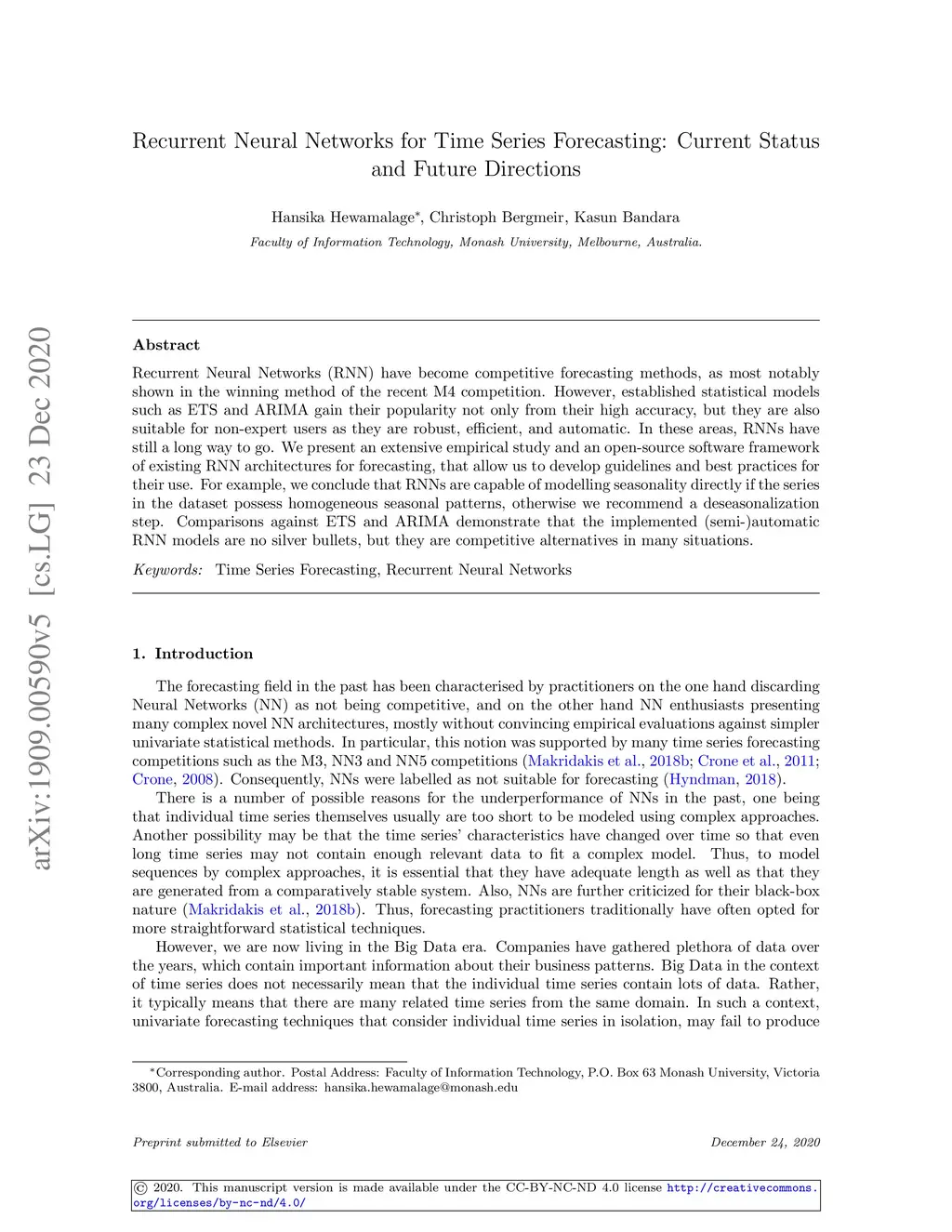 Recurrent Neural Networks (RNN) have become competitive forecasting methods, as most notably shown in the winning method of the recent M4 competition. However, established statistical models such as ETS and ARIMA gain their popularity not only from their high accuracy, but they are also suitable for non-expert users as they are robust, efficient, and automatic. In these areas, RNNs have still a long way to go. We present an extensive empirical study and an open-source software framework of existing RNN architectures for forecasting, that allow us to develop guidelines and best practices for their use. For example, we conclude that RNNs are capable of modelling seasonality directly if the series in the dataset possess homogeneous seasonal patterns, otherwise we recommend a deseasonalization step. Comparisons against ETS and ARIMA demonstrate that the implemented (semi-)automatic RNN models are no silver bullets, but they are competitive alternatives in many situations.