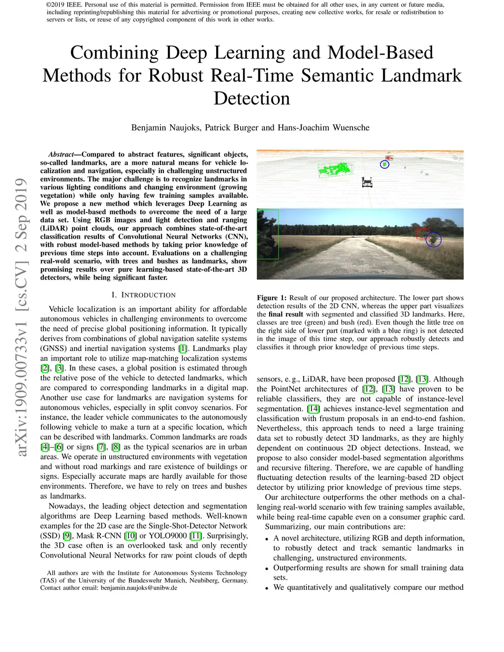 Compared to abstract features, significant objects, so-called landmarks, are a more natural means for vehicle localization and navigation, especially in challenging unstructured environments. The major challenge is to recognize landmarks in various lighting conditions and changing environment (growing vegetation) while only having few training samples available. We propose a new method which leverages Deep Learning as well as model-based methods to overcome the need of a large data set. Using RGB images and light detection and ranging (LiDAR) point clouds, our approach combines state-of-the-art classification results of Convolutional Neural Networks (CNN), with robust model-based methods by taking prior knowledge of previous time steps into account. Evaluations on a challenging real-wold scenario, with trees and bushes as landmarks, show promising results over pure learning-based state-of-the-art 3D detectors, while being significant faster.