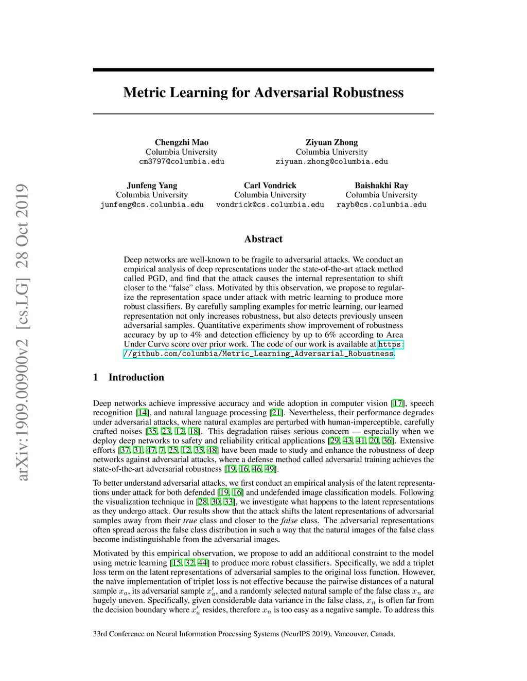 Deep networks are well-known to be fragile to adversarial attacks. We conduct an empirical analysis of deep representations under the state-of-the-art attack method called PGD, and find that the attack causes the internal representation to shift closer to the "false" class. Motivated by this observation, we propose to regularize the representation space under attack with metric learning to produce more robust classifiers. By carefully sampling examples for metric learning, our learned representation not only increases robustness, but also detects previously unseen adversarial samples. Quantitative experiments show improvement of robustness accuracy by up to 4% and detection efficiency by up to 6% according to Area Under Curve score over prior work. The code of our work is available at https://github.com/columbia/Metric_Learning_Adversarial_Robustness.