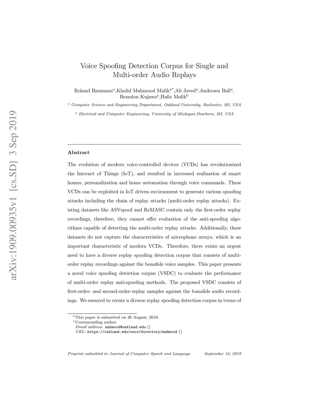 The evolution of modern voice controlled devices (VCDs) in recent years has revolutionized the Internet of Things, and resulted in increased realization of smart homes, personalization and home automation through voice commands. The introduction of VCDs in IoT is expected to give emergence of new subfield of IoT, called Multimedia of Thing (MoT). These VCDs can be exploited in IoT driven environment to generate various spoofing attacks including the replays. Replay attacks are generated through replaying the recorded audio of legitimate human speaker with the intent of deceiving the VCDs having speaker verification system. The connectivity among the VCDs can easily be exploited in IoT driven environment to generate a chain of replay attacks (multi-order replay attacks). Existing spoofing detection datasets like ASVspoof and ReMASC contain only the first-order replay recordings against the bonafide audio samples. These datasets can not offer evaluation of the anti-spoofing algorithms capable of detecting the multi-order replay attacks. Additionally, these datasets do not capture the characteristics of microphone arrays, which is an important characteristic of modern VCDs. We need a diverse replay spoofing detection corpus that consists of multi-order replay recordings against the bonafide voice samples. This paper presents a novel voice spoofing detection corpus (VSDC) to evaluate the performance of multi-order replay anti-spoofing methods. The proposed VSDC consists of first and second-order-replay samples against the bonafide audio recordings. Additionally, the proposed VSDC can also be used to evaluate the performance of speaker verification systems as our corpus includes the audio samples of fifteen different speakers. To the best of our knowledge, this is the first publicly available replay spoofing detection corpus comprising of first-order and second-order-replay samples.