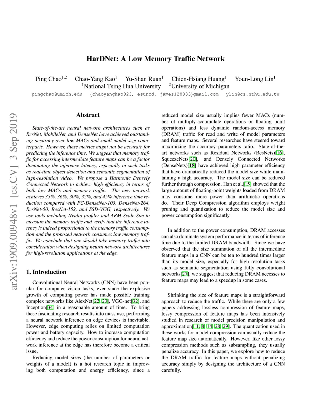 State-of-the-art neural network architectures such as ResNet, MobileNet, and DenseNet have achieved outstanding accuracy over low MACs and small model size counterparts. However, these metrics might not be accurate for predicting the inference time. We suggest that memory traffic for accessing intermediate feature maps can be a factor dominating the inference latency, especially in such tasks as real-time object detection and semantic segmentation of high-resolution video. We propose a Harmonic Densely Connected Network to achieve high efficiency in terms of both low MACs and memory traffic. The new network achieves 35%, 36%, 30%, 32%, and 45% inference time reduction compared with FC-DenseNet-103, DenseNet-264, ResNet-50, ResNet-152, and SSD-VGG, respectively. We use tools including Nvidia profiler and ARM Scale-Sim to measure the memory traffic and verify that the inference latency is indeed proportional to the memory traffic consumption and the proposed network consumes low memory traffic. We conclude that one should take memory traffic into consideration when designing neural network architectures for high-resolution applications at the edge.
