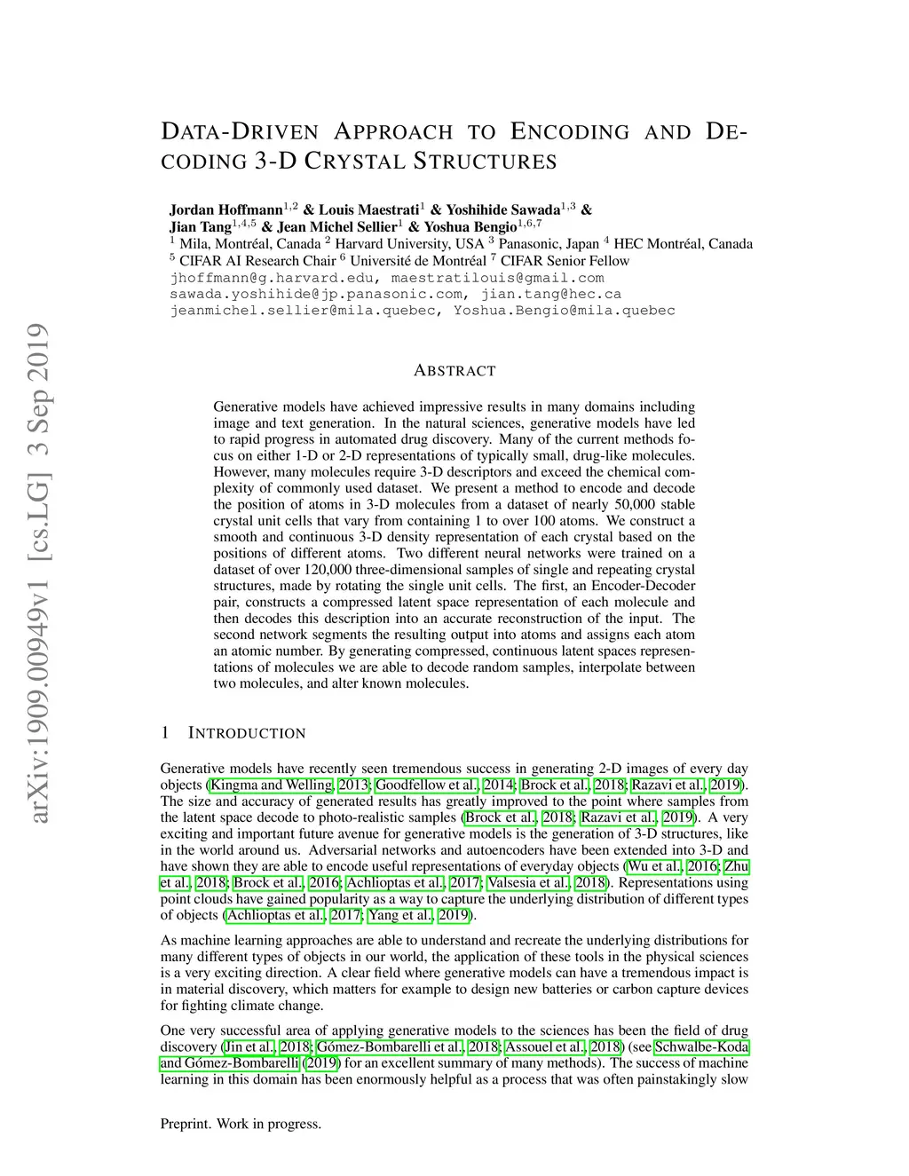 Generative models have achieved impressive results in many domains including image and text generation. In the natural sciences, generative models have led to rapid progress in automated drug discovery. Many of the current methods focus on either 1-D or 2-D representations of typically small, drug-like molecules. However, many molecules require 3-D descriptors and exceed the chemical complexity of commonly used dataset. We present a method to encode and decode the position of atoms in 3-D molecules from a dataset of nearly 50,000 stable crystal unit cells that vary from containing 1 to over 100 atoms. We construct a smooth and continuous 3-D density representation of each crystal based on the positions of different atoms. Two different neural networks were trained on a dataset of over 120,000 three-dimensional samples of single and repeating crystal structures, made by rotating the single unit cells. The first, an Encoder-Decoder pair, constructs a compressed latent space representation of each molecule and then decodes this description into an accurate reconstruction of the input. The second network segments the resulting output into atoms and assigns each atom an atomic number. By generating compressed, continuous latent spaces representations of molecules we are able to decode random samples, interpolate between two molecules, and alter known molecules.