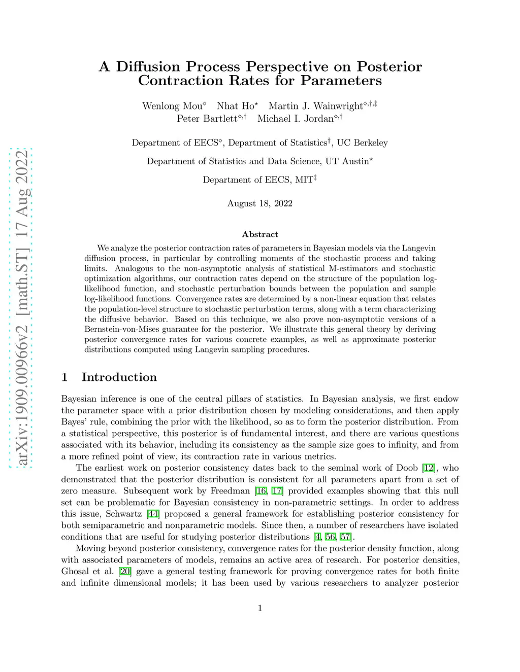 We show that diffusion processes can be exploited to study the posterior contraction rates of parameters in Bayesian models. By treating the posterior distribution as a stationary distribution of a stochastic differential equation (SDE), posterior convergence rates can be established via control of the moments of the corresponding SDE. Our results depend on the structure of the population log-likelihood function, obtained in the limit of an infinite sample sample size, and stochastic perturbation bounds between the population and sample log-likelihood functions. When the population log-likelihood is strongly concave, we establish posterior convergence of a -dimensional parameter at the optimal rate . In the weakly concave setting, we show that the convergence rate is determined by the unique solution of a non-linear equation that arises from the interplay between the degree of weak concavity and the stochastic perturbation bounds. We illustrate this general theory by deriving posterior convergence rates for three concrete examples: Bayesian logistic regression models, Bayesian single index models, and over-specified Bayesian mixture models.