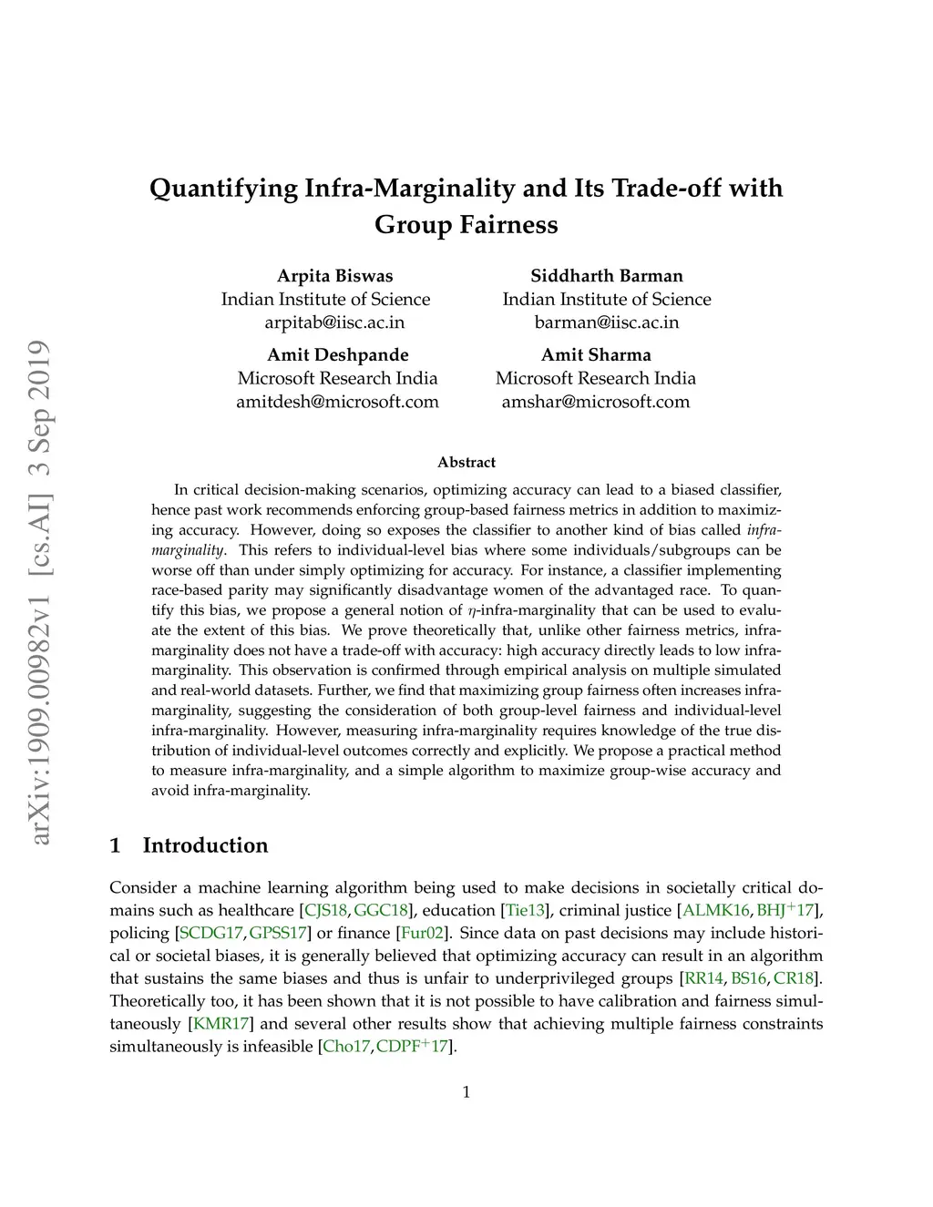 In critical decision-making scenarios, optimizing accuracy can lead to a biased classifier, hence past work recommends enforcing group-based fairness metrics in addition to maximizing accuracy. However, doing so exposes the classifier to another kind of bias called infra-marginality. This refers to individual-level bias where some individuals/subgroups can be worse off than under simply optimizing for accuracy. For instance, a classifier implementing race-based parity may significantly disadvantage women of the advantaged race. To quantify this bias, we propose a general notion of -infra-marginality that can be used to evaluate the extent of this bias. We prove theoretically that, unlike other fairness metrics, infra-marginality does not have a trade-off with accuracy: high accuracy directly leads to low infra-marginality. This observation is confirmed through empirical analysis on multiple simulated and real-world datasets. Further, we find that maximizing group fairness often increases infra-marginality, suggesting the consideration of both group-level fairness and individual-level infra-marginality. However, measuring infra-marginality requires knowledge of the true distribution of individual-level outcomes correctly and explicitly. We propose a practical method to measure infra-marginality, and a simple algorithm to maximize group-wise accuracy and avoid infra-marginality.